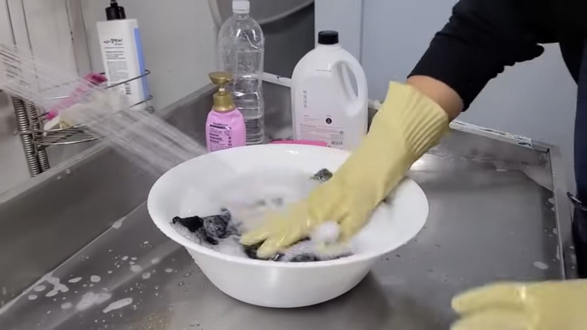 10~15분 정도 방치한 뒤 깨끗한 찬물에 여러 번 헹굽니다. 이때 니트를 상하로 자주 들어 올리면 늘어날 수도 있으니 그보다는 손으로 누르면서 비누 거품을 빼주는 방식으로 진행해 주세요.