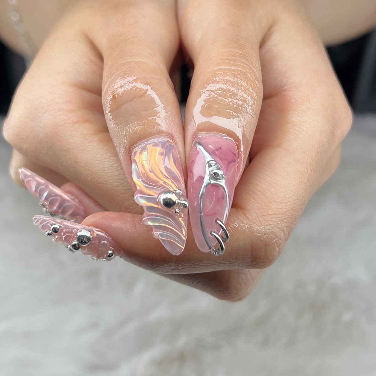 ‘스파게티’로 돌아온 르세라핌 허윤진에게서 반짝이는 건 투스젬만이 아니었습니다. 그녀는 손톱에 반 구 모양의 파츠를 얹어 마치 네일 위에 피어싱을 한 것처럼 연출했어요. 여기서 끝이 아닙니다. 피어싱 네일은 허윤진처럼 파츠를 활용하는 방법도 있지만 살 위로 자란 네일을 핸드 드릴을 이용해 뚫어 장식을 달아 강렬한 이미지를 전달하기도 하죠.