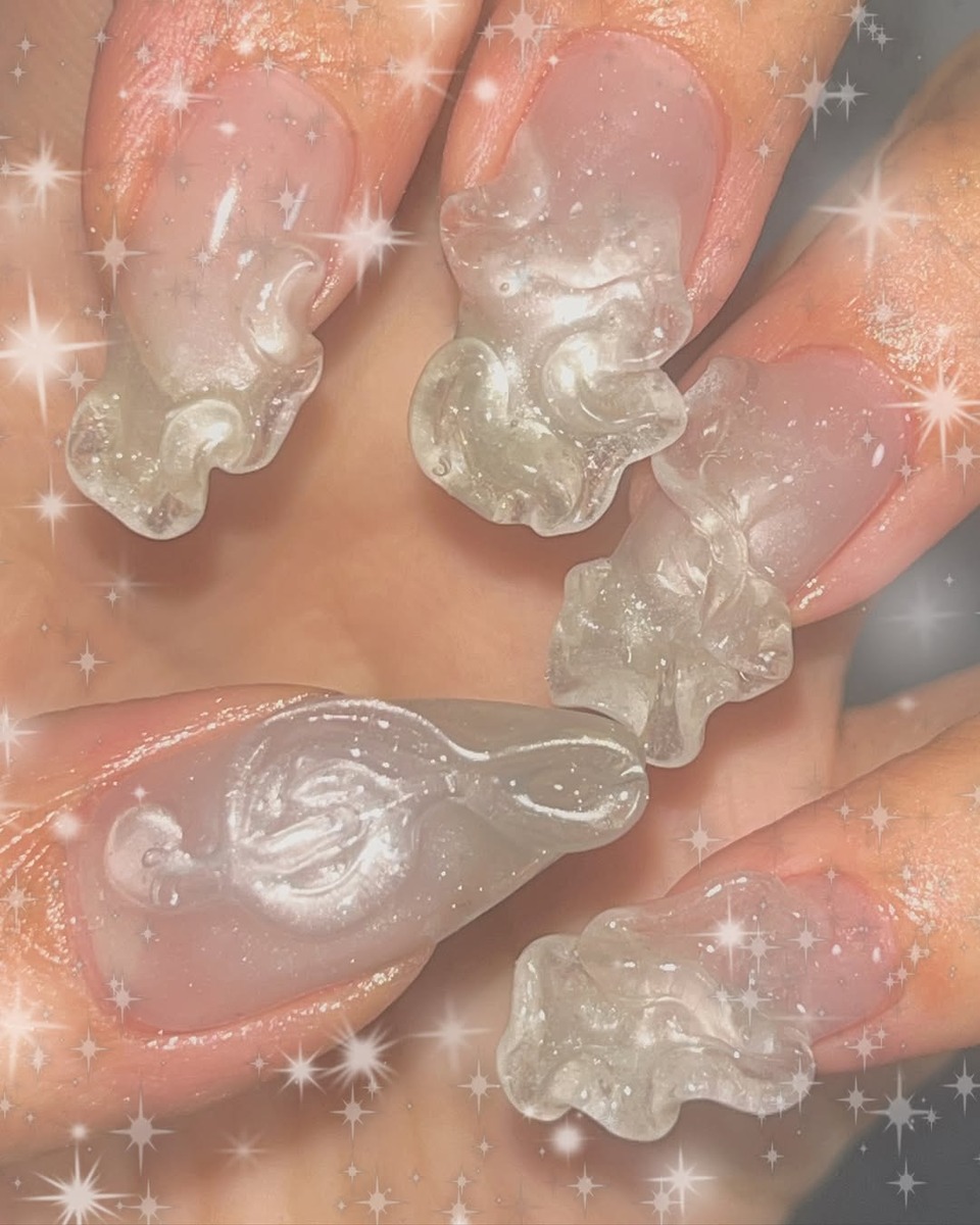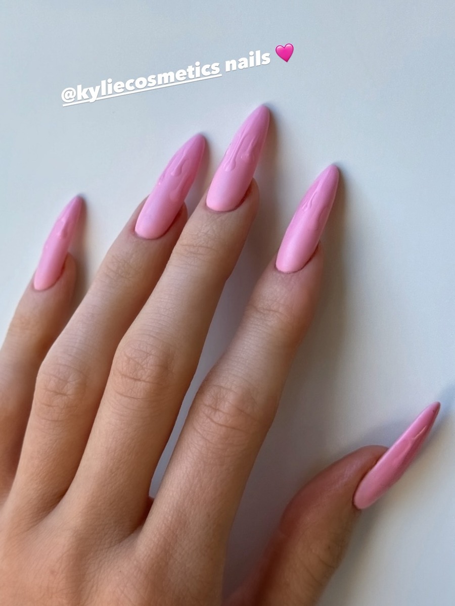 카일리의 딸기 우윳빛 네일을 자세히 보면 그녀의 뷰티 브랜드, 카일리 뷰티의 상징인 드립 모양이 마치 부조를 뜬 것처럼 올라가 있는 걸 확인할 수 있습니다. 이는 그녀는 물론 제니, 켄달 제너, 헤일리 비버, 시드니 스위니, 사브리나 카펜터 등 요즘 가장 핫한 셀럽들의 네일을 책임지는 ‘조라 간조리그(Zola Ganzorigt)’가 담당했죠. 참고로 조라는 몇 년 전 헤일리가 해서 핫해진 ‘글레이즈드 네일’을 디자인하기도 했습니다.