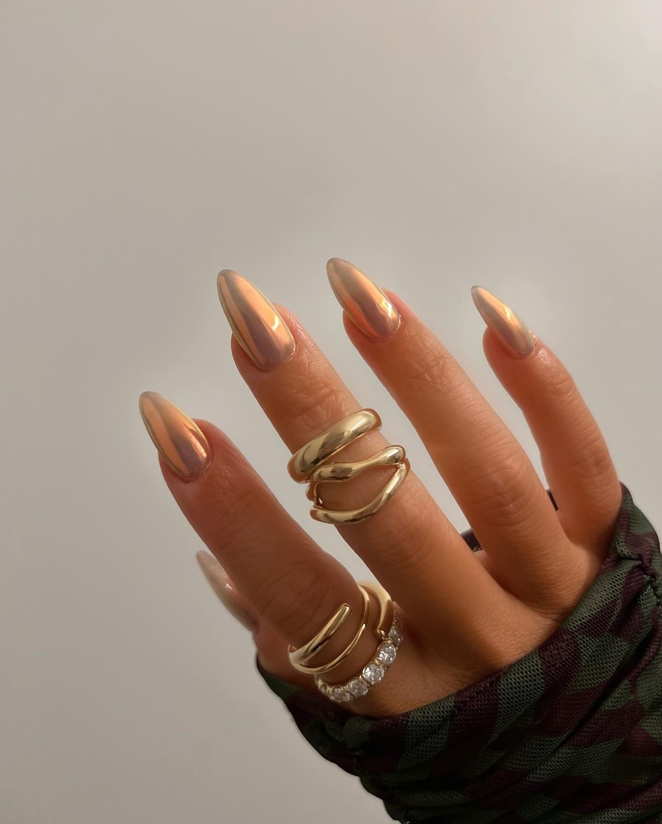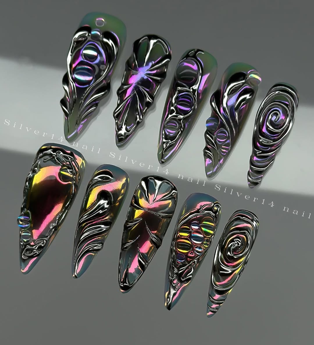 크롬 네일은 크게 두 가지로 나뉘어 집니다. 매끈한 표면에 빛을 받아 무지개색으로 반짝이는 메탈을 연상케 하는, 쇠맛에 가까운 것과 진주나 조개껍데기에서 볼 수 있는, 펄감이 도는 오묘한 무지갯빛을 머금은 네일을 말하기도 합니다. 위와 아래 이미지를 보면 그 차이점을 좀 더 확실히 느낄 수 있을 거예요.