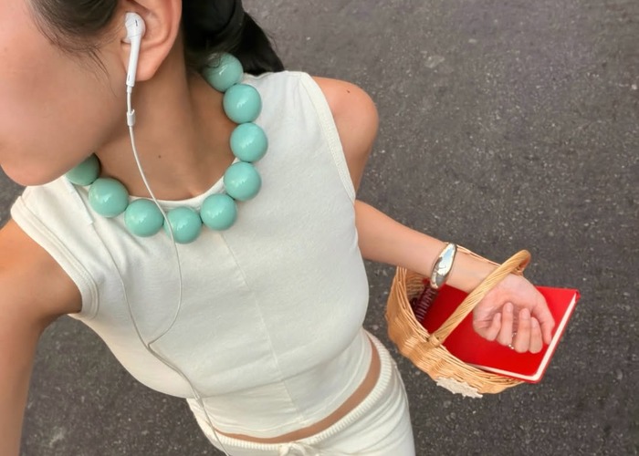 캘리포니아 걸 무드가 물씬 풍기는 배색 스윔웨어를 입은 김나영. 올해 유행인 쉘 네크리스로 바캉스 무드를 더한 후, 젠틀한 실루엣이 돋보이는 라피아 햇과 선글라스로 그녀 특유의 세련되고 고급스러운 분위기를 가미했다. 여기서 놓치지 말아야 할 포인트는 바로 바닥에 깔린 피크닉 매트. 인생 사진을 건지고 싶다면 배경에 사용되는 소품 또한 수영복과 자연스럽게 잘 어울리는 컬러로 선택해야 한다.