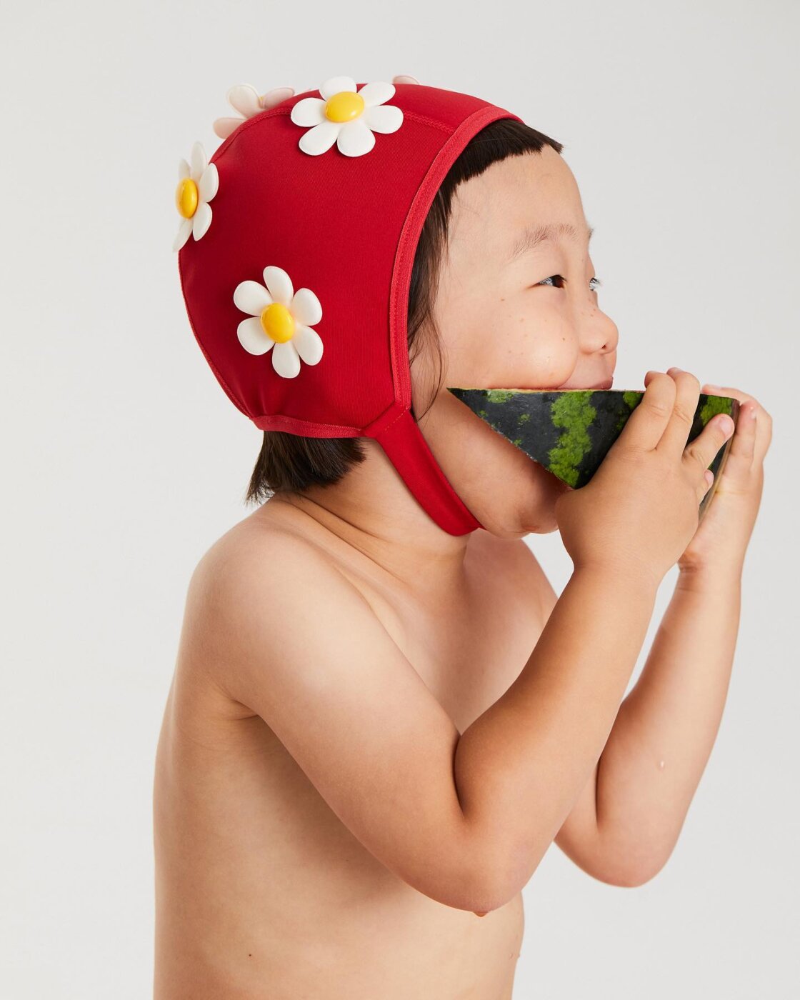 데이지 꽃이 장식된 레트로한 디자인의 깜찍한 수영 모자, 너무 귀엽지 않나요? SNS에 등장하자마자 빠른 속도로 품절 행진을 기록했던 레디투킥의 베스트 셀러 ‘플라워 딥’은 어린 아이부터 할머니까지 누가 써도 1초 만에 사랑스럽게 변신시켜주는 마법의 아이템이에요. 턱 끈이 있어서 고정이 잘 되고 귀도 덮을 수 있어서 유용해요. 쭉쭉 잘 늘어나고 잘 마르는 원단으로 제작하여 사용성도 높였죠. 레디투킥은 미디어 스타트업 뉴닉에서 디자이너로 근무했던 양수현 디렉터가 출산 후 새로운 도전으로 런칭한 스윔 룩 브랜드에요. 그녀의 감각은 룩북에서 진가를 발휘하는데요. 플라워 딥을 쓰고 수박을 먹는 꼬마 친구, 수줍게 미소 짓는 할머니가 등장하는 캠페인 룩을 보고 있으면 미소가 절로 지어져요. 앞으로의 행보가 기대되는 브랜드입니다.