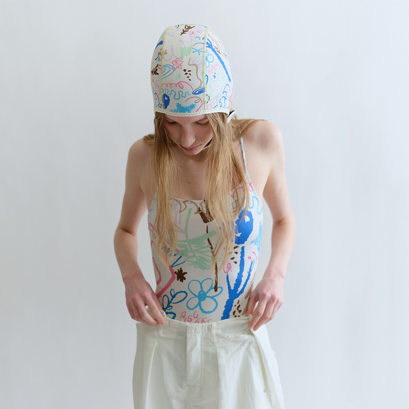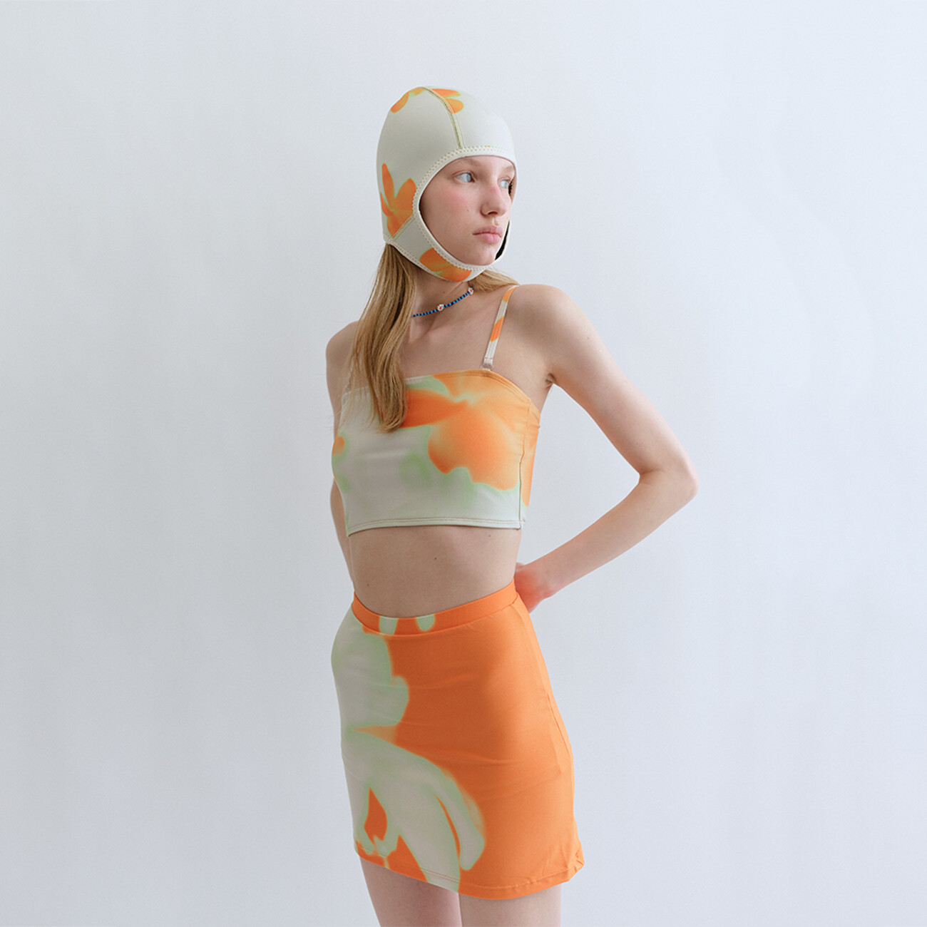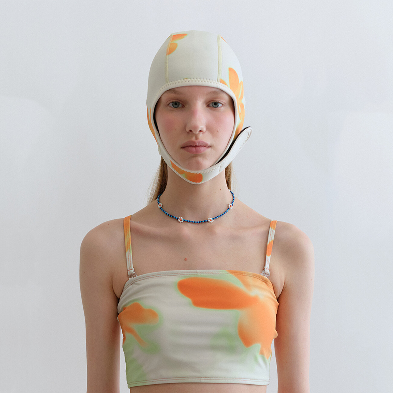 여성스럽고 관능적인 디자인의 수영복보다는 개성 있고 색깔 있는 수영복을 만들고 싶었다는 브랜드 파이시스. 유니크하고 독특한 매력의 패턴을 직접 개발하여 수영복을 선보이고 있는 파이시스의 이번 시즌 아이템은 한층 더 자유 분방하고 멋스러워요. 수구 모자에서 모티브를 얻은 수영 모는 낙서한 듯한 그래픽에 파스텔 톤의 컬러감을 입힌 두들드로잉 스위밍 캡, 오렌지 컬러의 플라워로 볼드하게 장식된 플라워 스위밍 캡으로 시선을 끌죠. 턱 끝에 부착된 벨크로 스트랩으로 사이즈 조절과 여밈이 가능하고 귀도 덮을 수 있어요. 가격은 모두 49,000원.