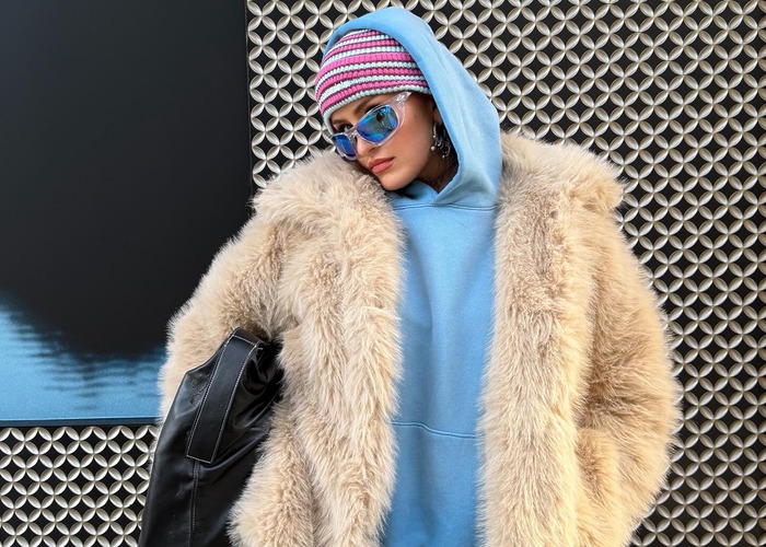 터프한 매력의 슬리브리스 가죽 바이커 재킷, 셔링 디테일의 폴카 도트 패턴 스커트는 발리(Bally). 타이트한 화이트 톱은 블루마린(Blumarine). 빈티지한 볼 캡은 골든구스(Golden Goose). 스틸레토 포인트의 플랫 슈즈는 발렌티노 가라바니.
