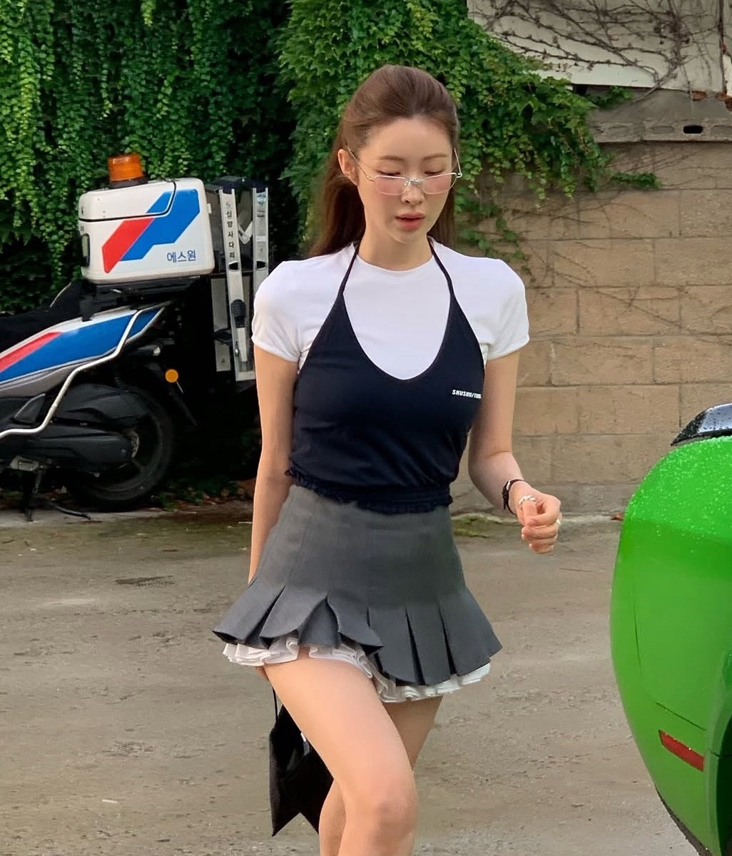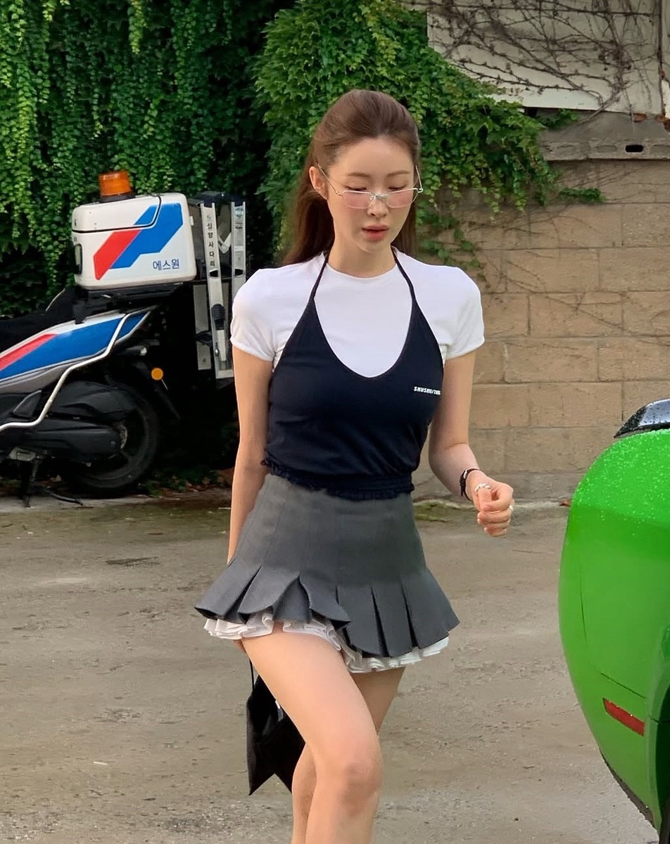 미니 플리츠 스커트를 완벽하게 소화하는 또 하나의 공식! 몸에 딱 맞는 심플한 톱을 매치해보세요. 차정원처럼 레이어드로 포인트를 더한 후, 프레임이 얇은 안경이나 선글라스를 얹으면 군더거기 없이 깔끔하면서도 은근하게 힙한 프레피 룩 완성!