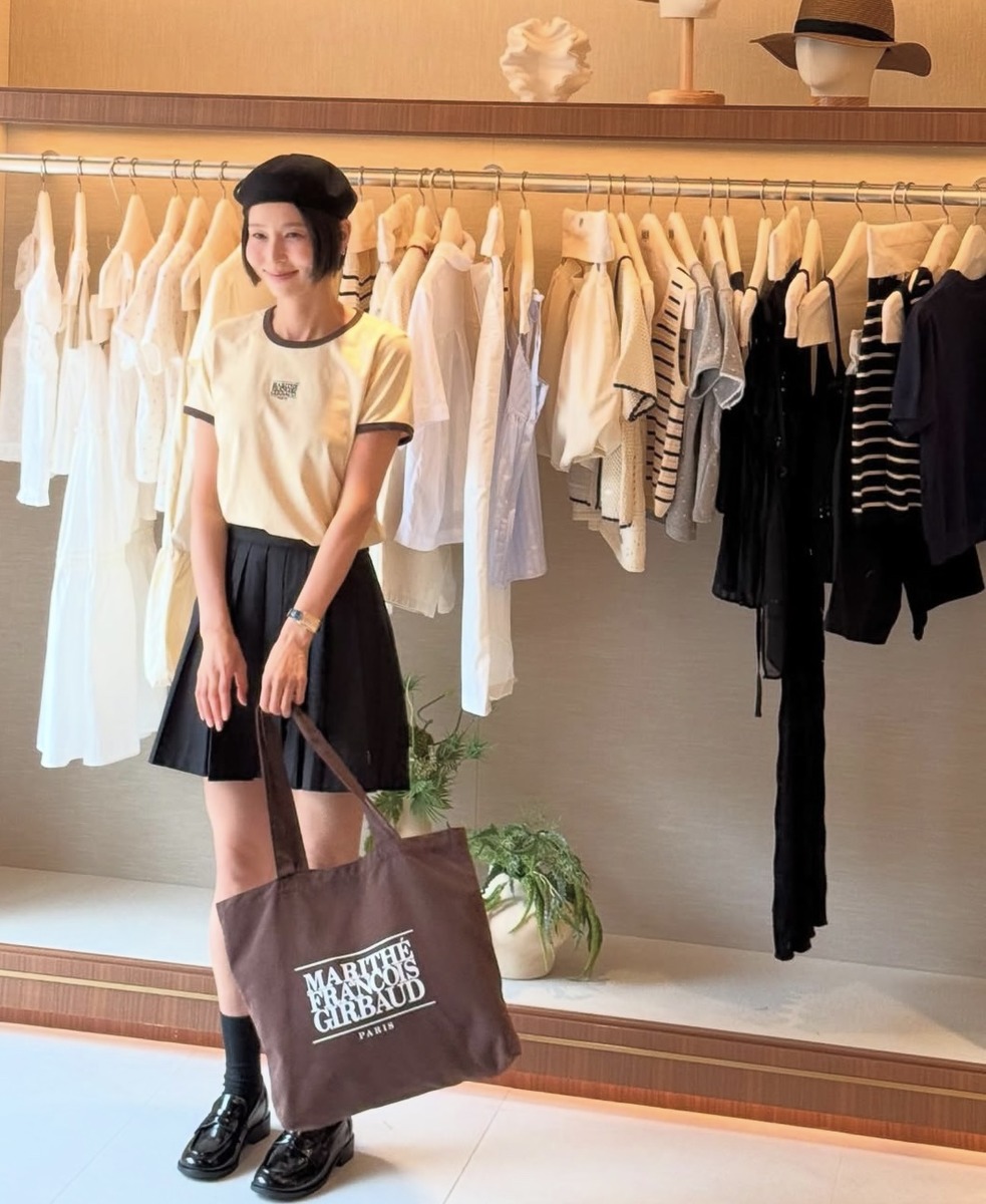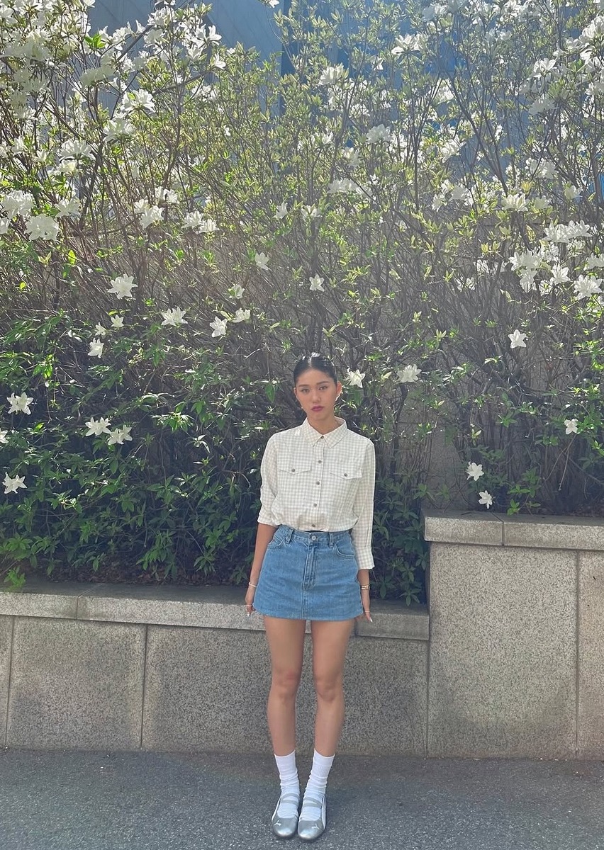 클래식의 대명사라해도 과언이 아닌 심플한 미니 스커트는 미미처럼 셔츠에 매치해보세요! 패턴이 더해진 셔츠라면 은근하게 캐주얼한 느낌까지 더할 수 있죠. 요즘 유행하는 납작한 메리제인 스니커즈로 힙한 감성도 놓치지 마세요.