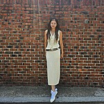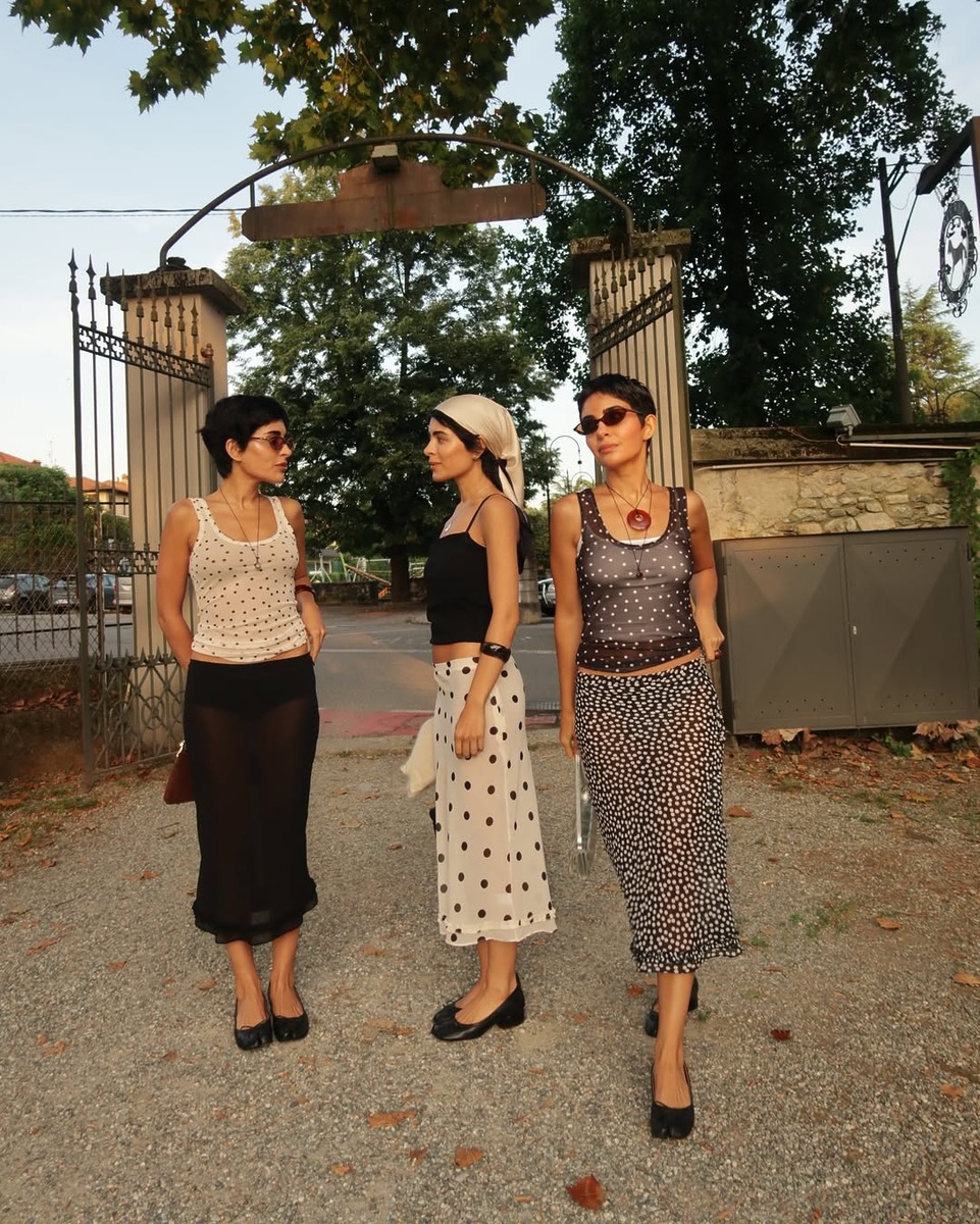 이번 시즌 빠질 수 없는 도트! 미디스커트는 이 도트 패턴을 어렵지 않게 시도할 수 있는 아이템 중 하나입니다. 이 계절에 맞게 시어한 텍스처를 지닌 것을 골라주면 트렌드와 계절감 모두 잡을 수 있죠. 여기에 깔끔한 핏의 슬리브리스를 매치해주면 꾸안꾸 무드의 여름 데일리 룩을 완성할 수 있습니다.