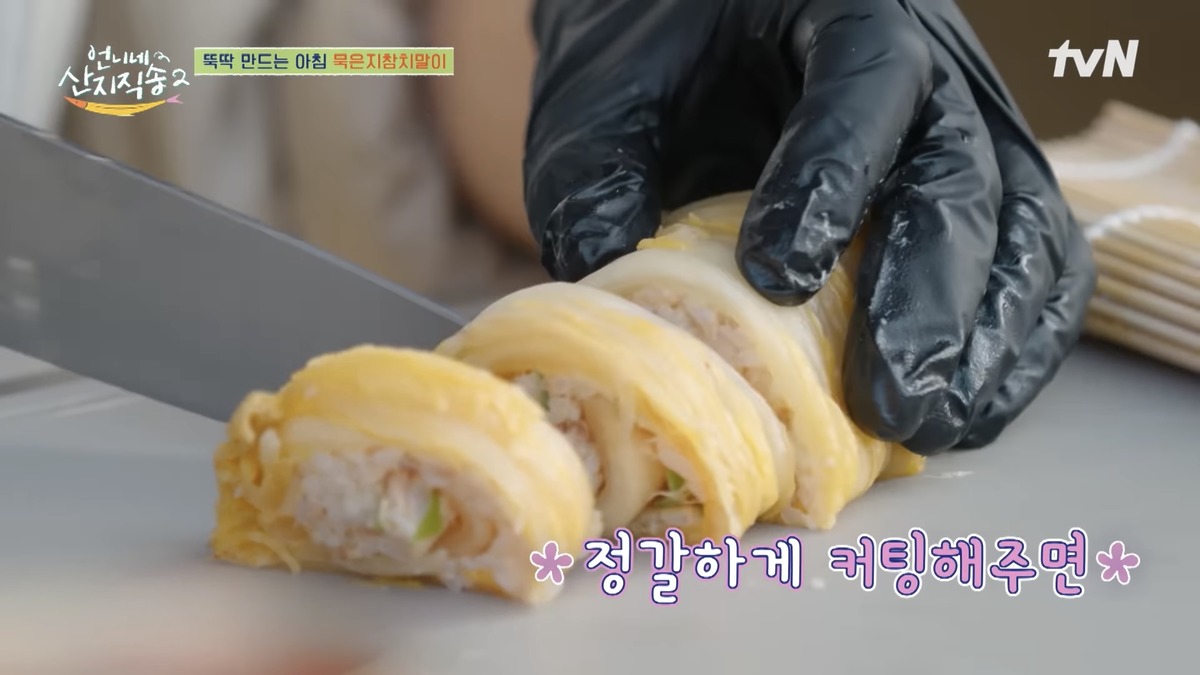 - 3. 김밥 발에 김 대신 배추김치를 올리고 그 위에 참치와 섞은 밥을 얹어 준 뒤 말아 줍니다.