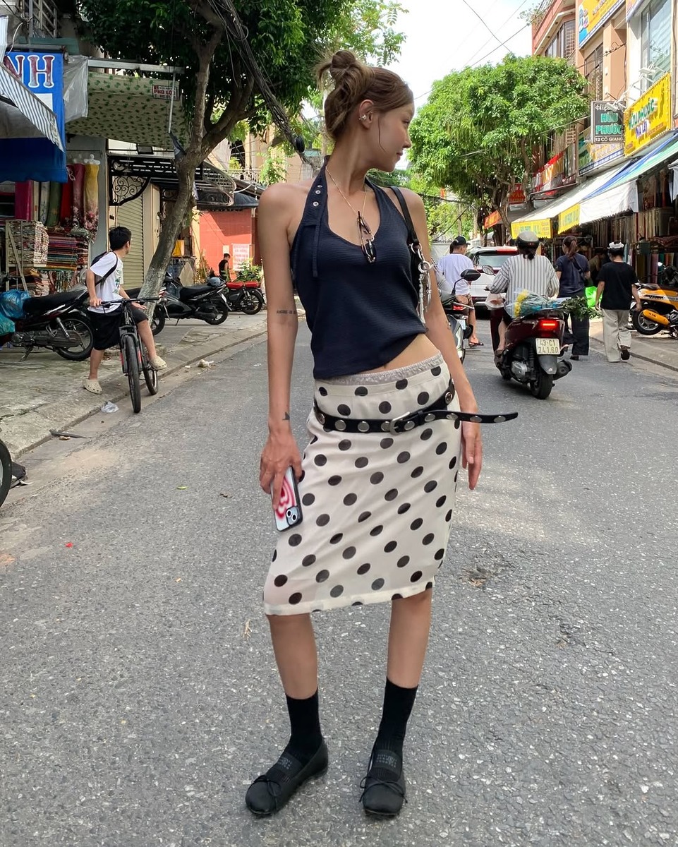 홀터넥 + 로우라이즈 미디스커트