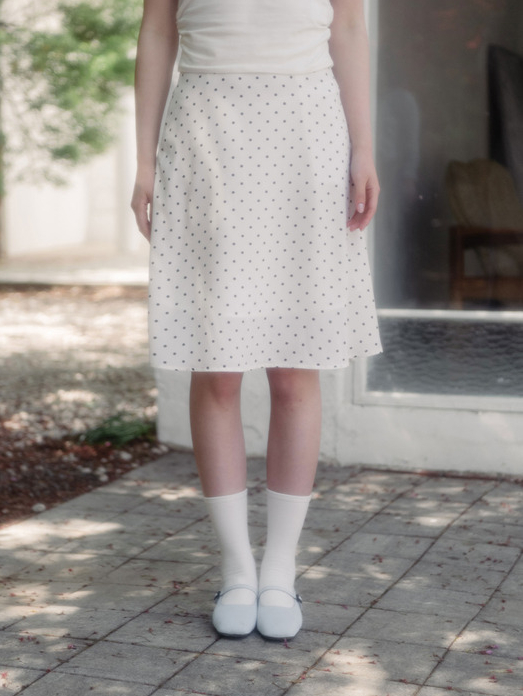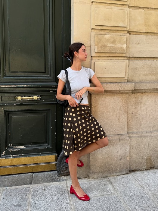 패턴이 들어간 미디스커트를 입고 싶을 땐, 심플한 크롭 반팔 티셔츠를 매치해 보세요. 도트처럼 그 자체만으로 개성 있는 포인트를 활용해 기본 컬러의 크롭 티셔츠로 균형을 잡아주면 좋답니다. 상의는 짧게! 하의는 길게! 크롭 티셔츠에 미디스커트를 매치하면 롱 스커트 혹은 미니스커트보다 오히려 다리가 길어 보여 비율이 좋아 보이는 효과를 얻을 수 있을 거예요.