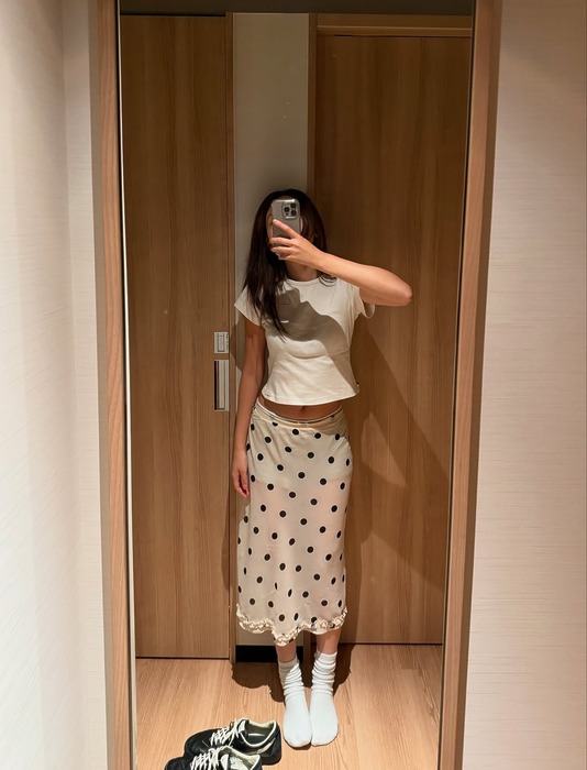 크롭 반팔티 + 도트 미디스커트