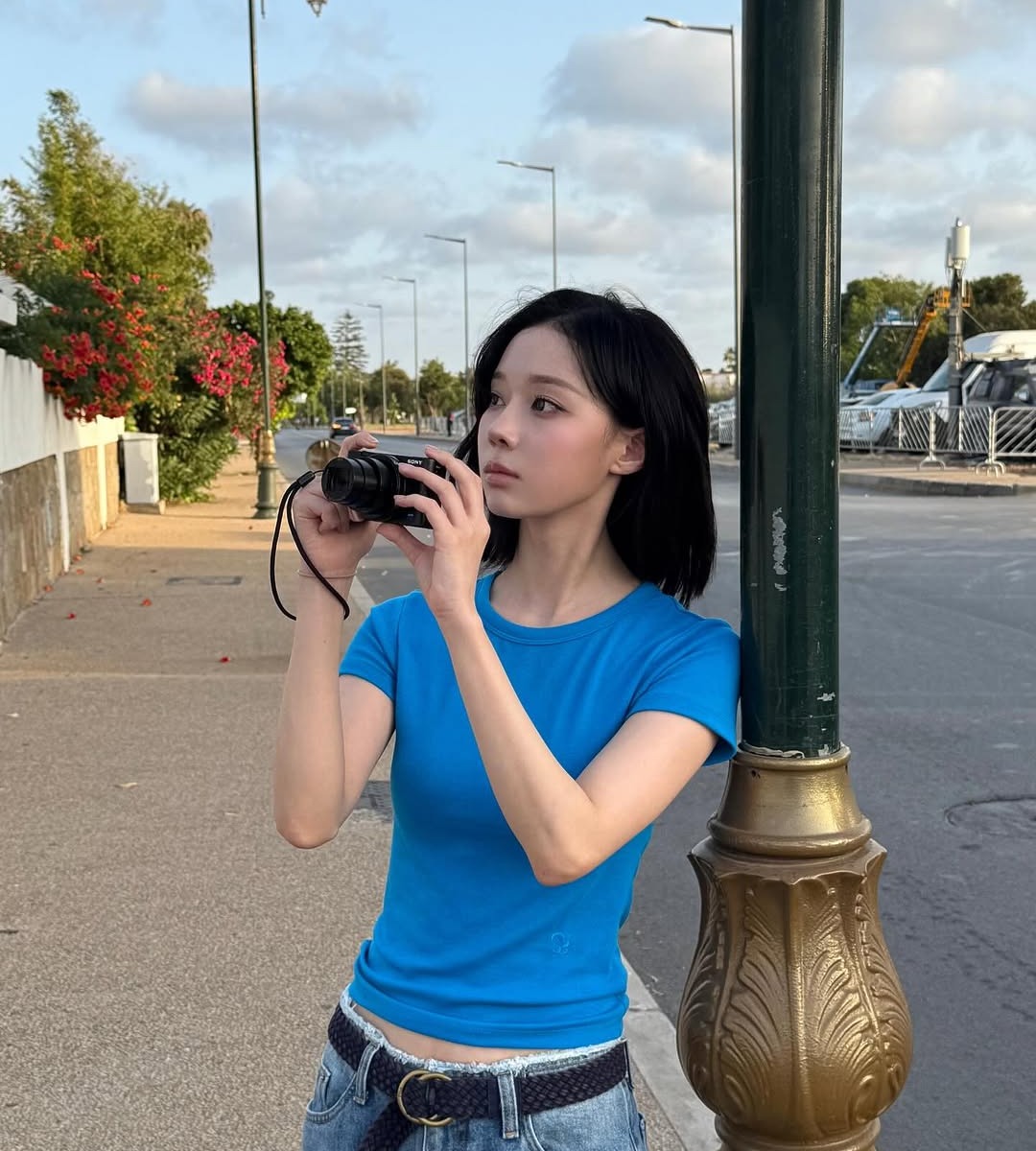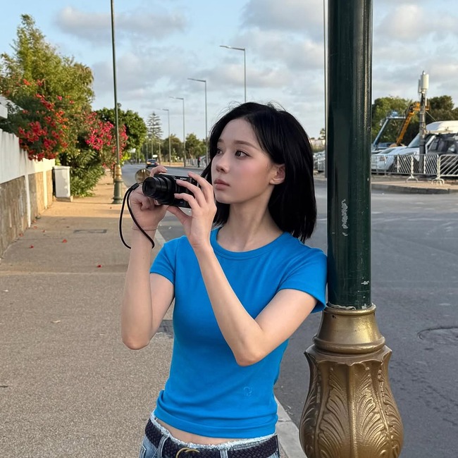 흰티가 지겨울 땐 비비드한 블루 컬러 티셔츠 하나로 분위기를 전환해 보세요. 윈터는 몸에 딱 맞는 푸른 티셔츠에 데님 팬츠를 매치했어요. 단정한 무드 속에서도 시선을 끄는 건 허리를 감싼 우븐 벨트. 작은 아이템 하나가 룩 전체에 밀도를 더해줘요.