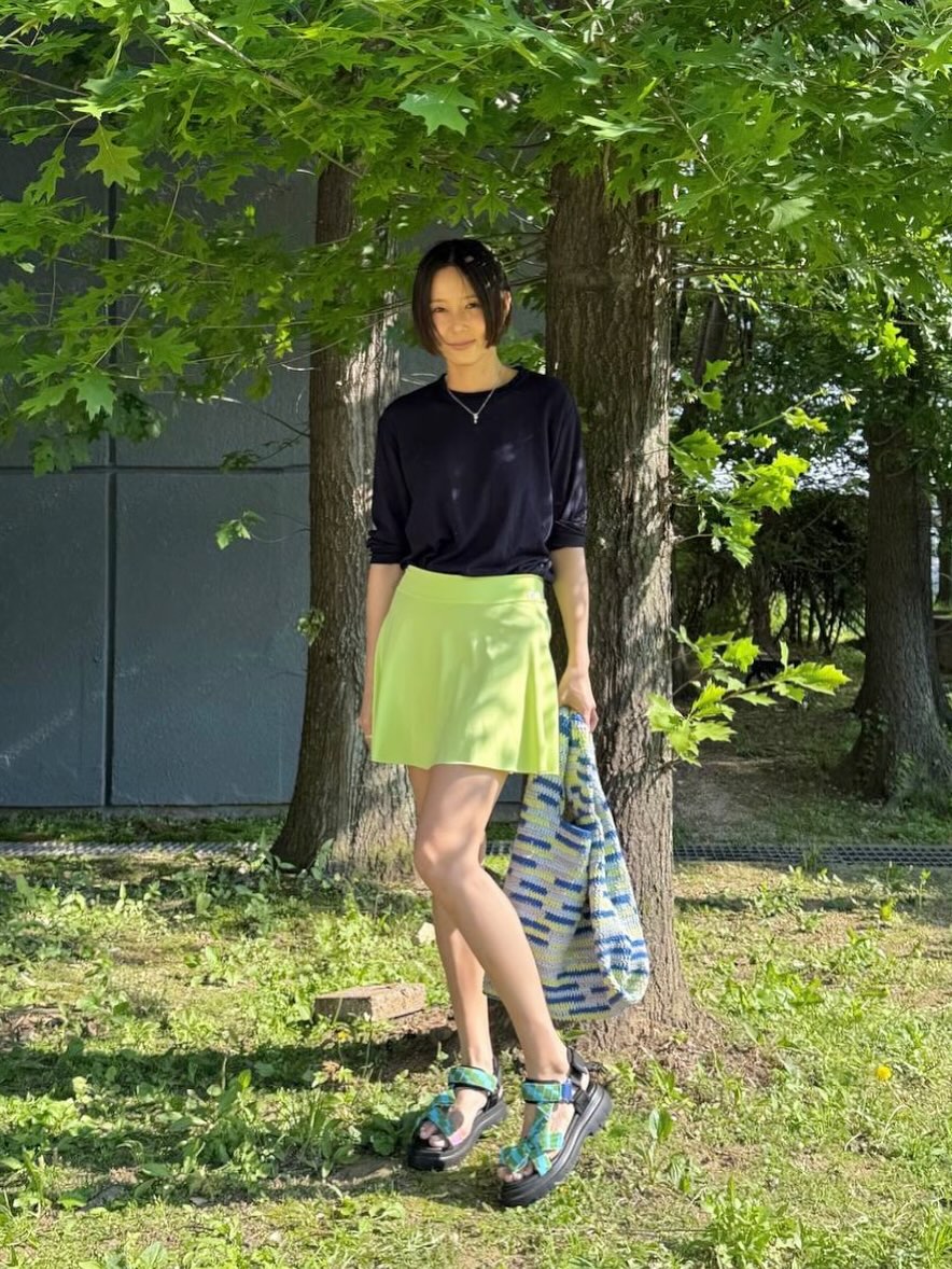 얇은 긴팔 무지 티셔츠는 자칫하면 잠옷처럼 보일 수 있어요. 그래서 함께 매치하는 아이템이 더욱 중요해요. 김나영은 네이비 긴팔 티셔츠에 네온 컬러 스커트로 시선을 집중시키고, 프린트가 화려한 백과 샌들을 더해 전체적인 룩에 활기를 불어넣었어요.
