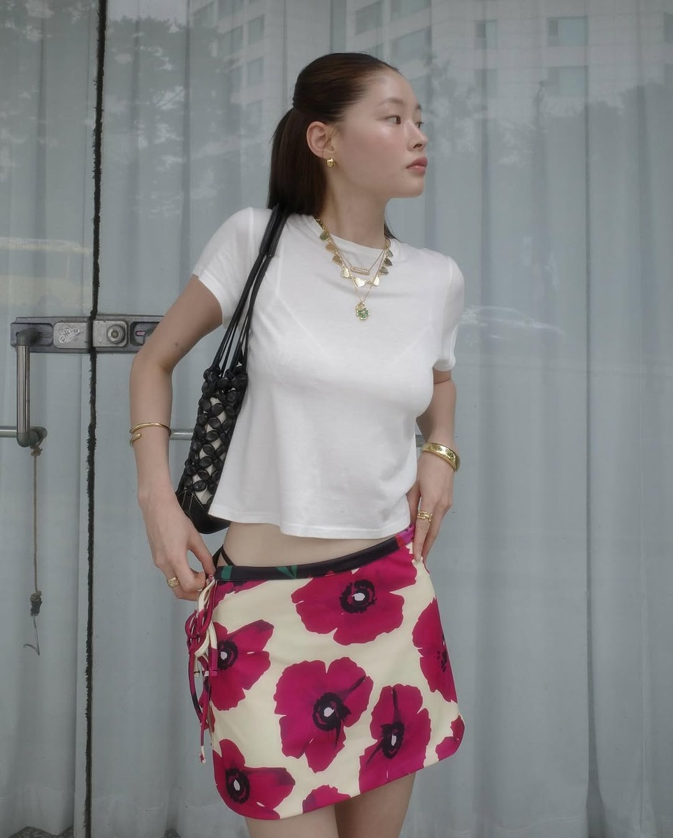 흰티와 플로럴 스커트 조합은 자칫하면 평범함해 보일 수 있지만, 패턴과 실루엣을 어떻게 고르느냐에 따라 전혀 다른 분위기를 만들 수 있어요. 손연재는 걸리시한 잔잔한 플로럴 패턴의 스커트를, 윤이재는 보다 강렬한 컬러감의 스커트를 선택해 개성을 드러냈죠. 페미닌한 감성을 유지하면서도 캐주얼함을 살릴 수 있는 여름 데일리룩의 정석이에요.