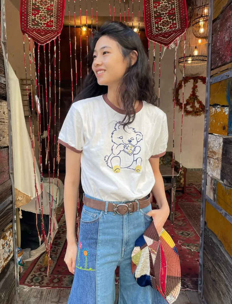 패치워크 데님 재킷 위에 키치한 프린트의 오버사이즈 티셔츠를 겹쳐 입고, 반짝이는 플랫슈즈로 마무리한 키키 하음. 재킷과 티셔츠의 그래픽이 조화를 이루며 시선을 사로잡고, 메탈릭한 슈즈가 은근한 포인트 역할을 톡톡히 해요. 한 가지 아이템에 치중하기보다는, 각 요소들이 살짝 튀는 방식으로 어우러져 자유로운 키치 무드를 연출하는 것도 좋은 방법입니다.