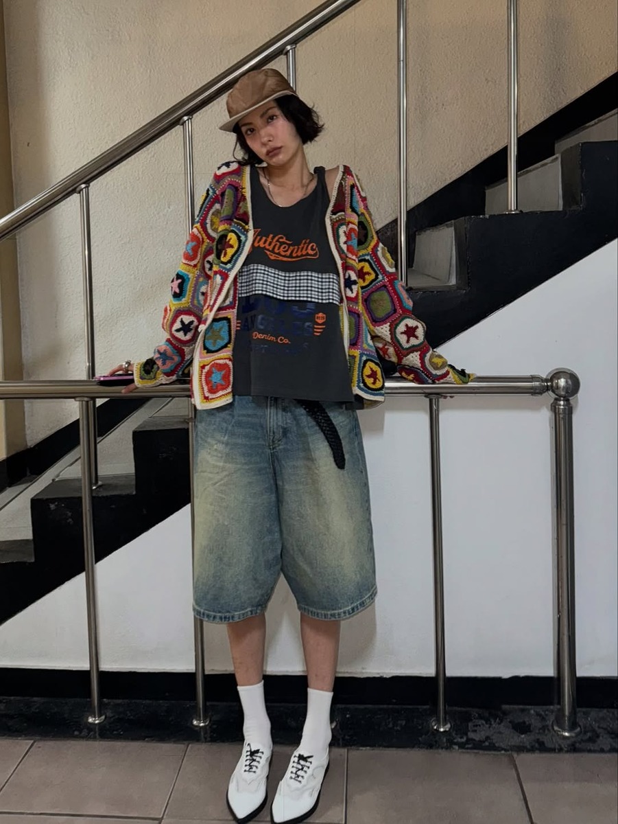 여름에는 무거운 아우터보다 가볍고 스타일리시한 크로셰 카디건이 제격이에요. 나나처럼 데님 쇼츠 위에 알록달록한 패치워크 니트를 살짝 걸치면 끝! 실루엣이 드러나는 얇은 니트 짜임과 다채로운 컬러감이 룩 전체에 리듬감을 더해주는 비법이랍니다.