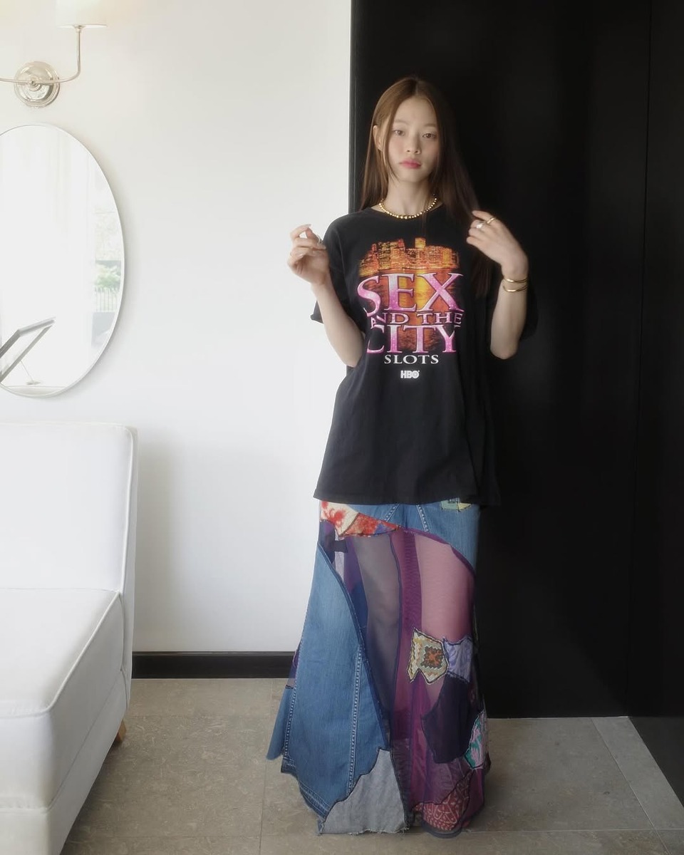 자칫 잘못하면 할머니 옷처럼 보일 수 있는 패치워크 아이템을 트렌디하게 소화하고 싶다면 윤이재처럼 시도해 보세요. 데님과 시스루 소재가 섞인 패치워크 스커트에 박시한 그래픽 티셔츠, 그리고 반짝이는 골드 주얼리까지. 개성 넘치는 아이템을 활용해 조화로운 스타일링을 완성했어요.
