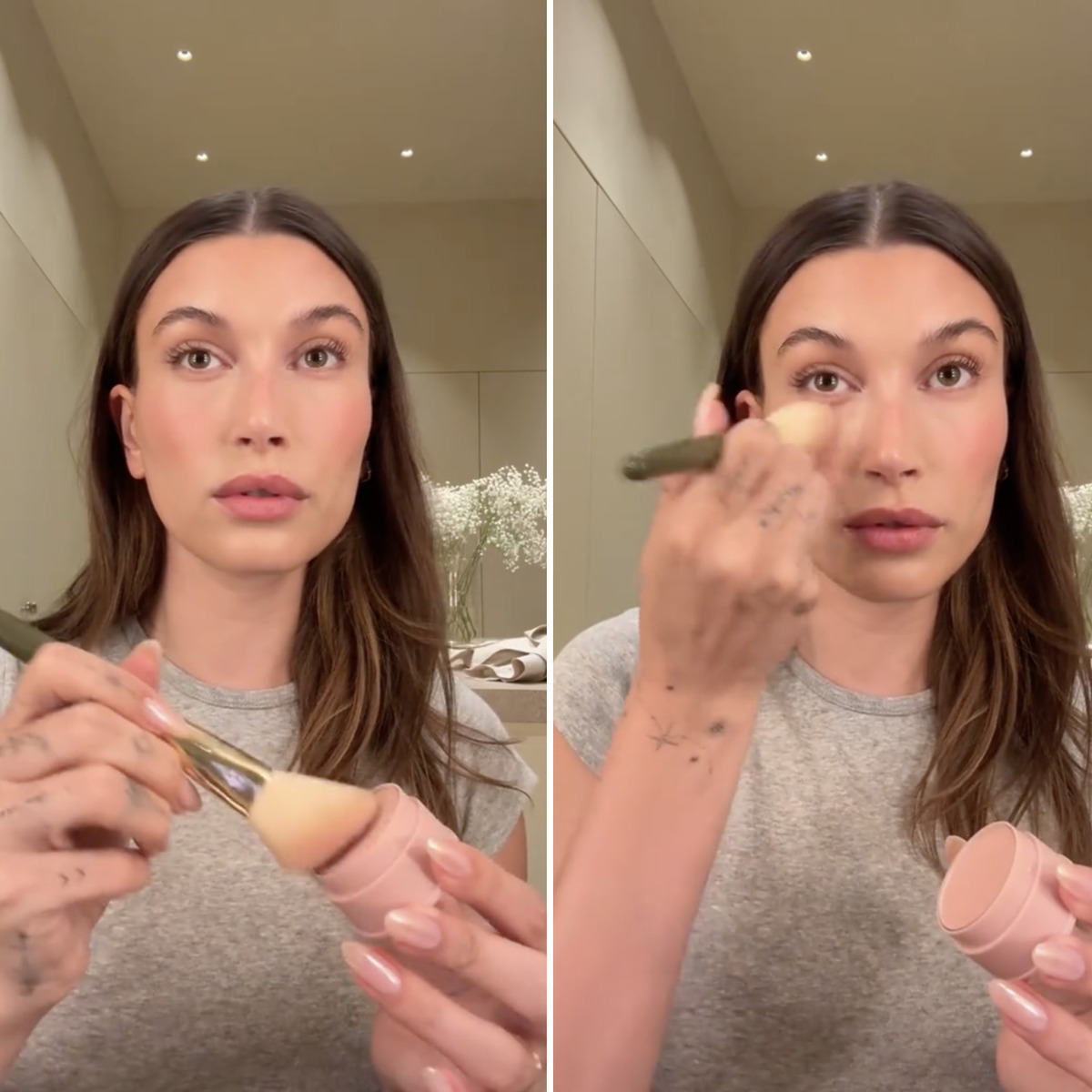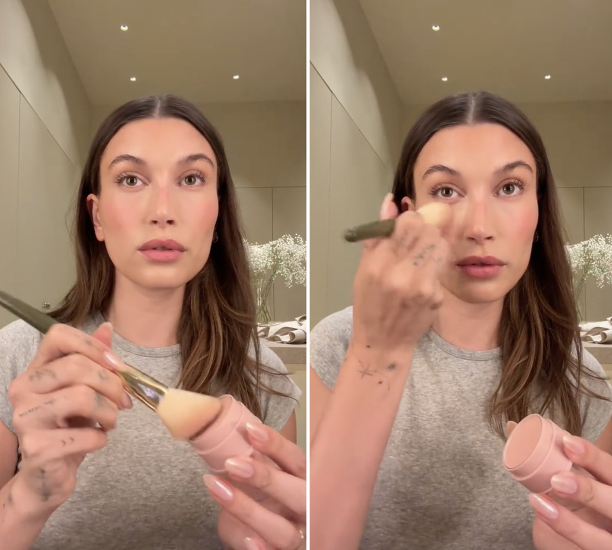 한편 메이크업 루틴 속에서도 K뷰티템을 발견할 수 있었는데요. 헤일리 비버가 로드 스킨의 크림 블러셔를 바른 후 위에 포인트 메이크업으로 얹어준 아이템은 바로 토니모리의 치크톤 젤리 블러셔. 내장된 퍼프로 톡톡 두드려 바를 수도 있지만, 그는 치크 브러쉬를 사용해 레이어링 해주었네요.