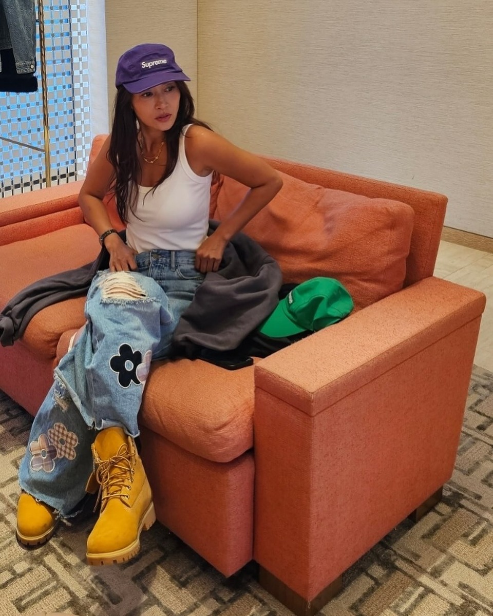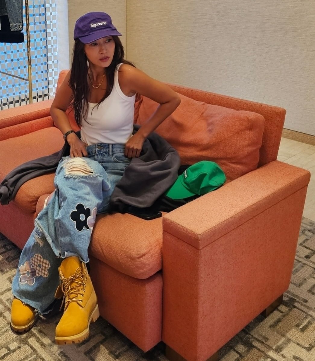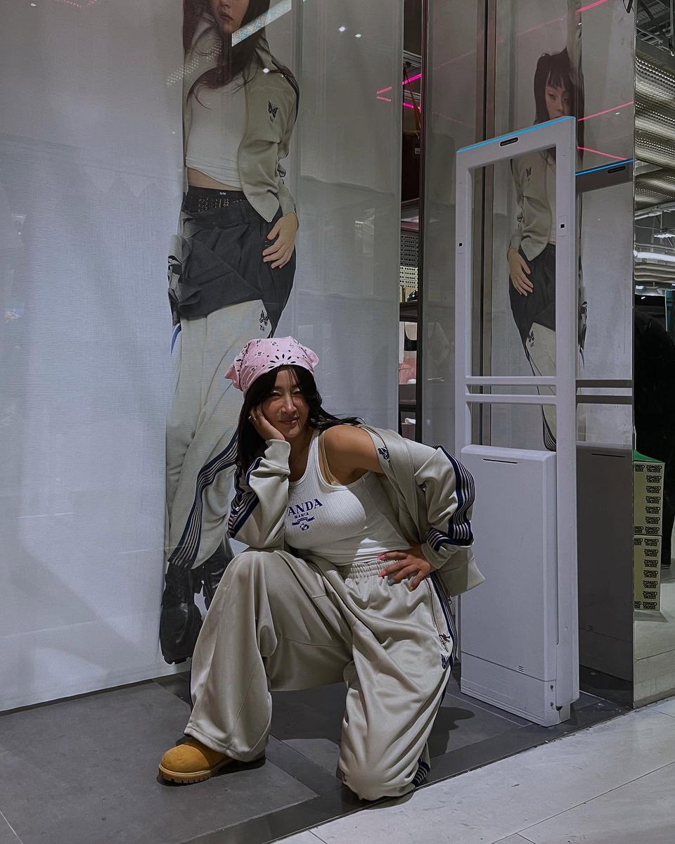 <월드 오브 스우파> 같은 걸크러시 패션을 즐기는 황보. 슬리브리스나 컷아웃 디테일의 ‘쫄티’에 힙합 바지를 입으면 섹시하면서도 멋있는 스우파 분위기가 나죠. 요즘 유행하는 양갈래 땋은 머리도 잘 어울리죠?