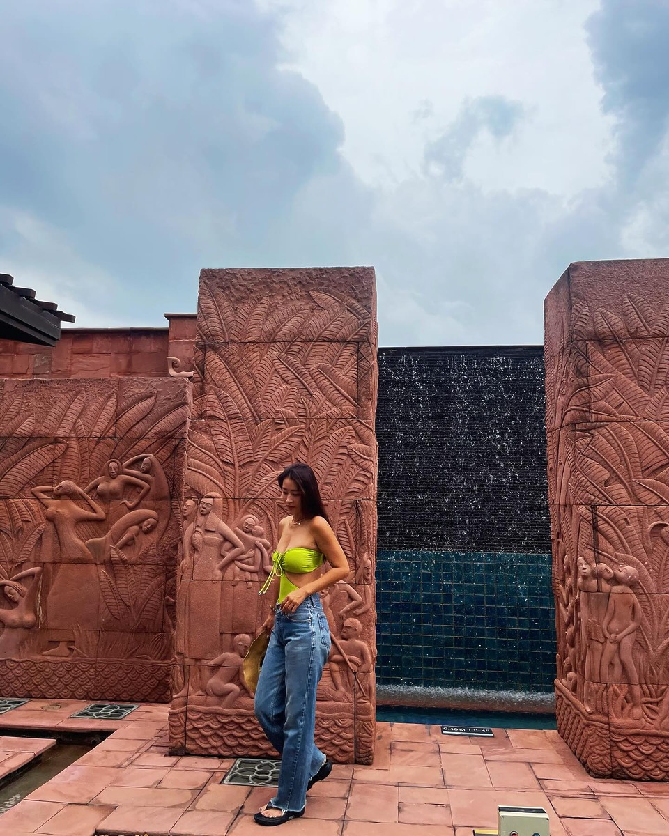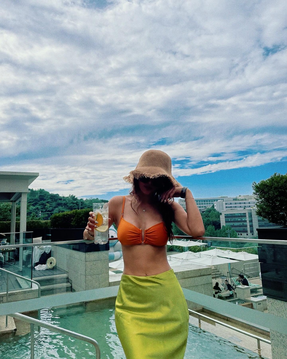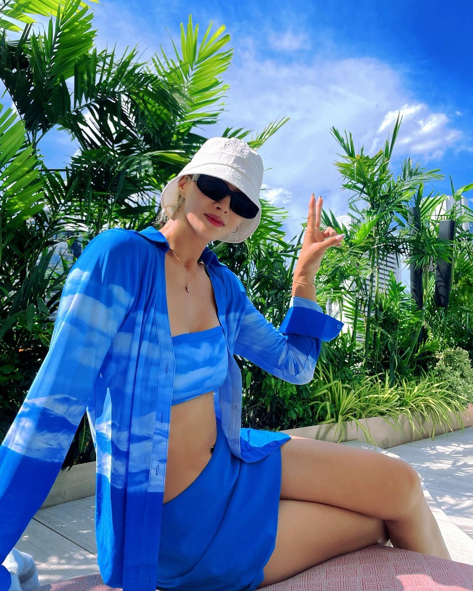 휴양지에서 사진발 잘 받는 방법. 자연 배경과 잘 어우러지는 옷을 입는 것이죠. 새파란 하늘이 프린트된 비키니를 셔츠와 셋업으로 입은 황보처럼요. 모노키니 수영복 위에 데님 팬츠를 입은 스타일링도 눈에 띄네요.