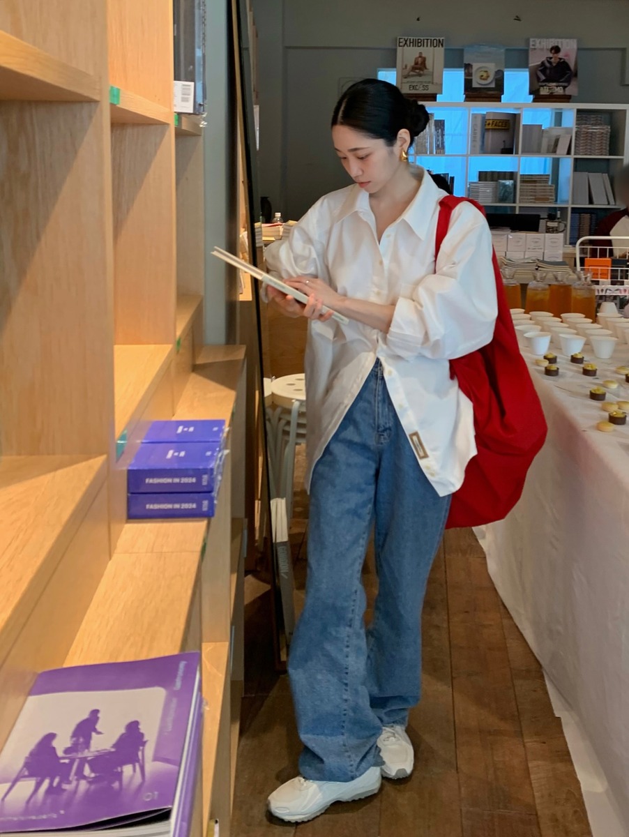 시작은 단정하게 해볼까요? 먼저 지수는 오버핏의 화이트 셔츠에 스트레이트 데님, 그리고 화이트 운동화로 통일감을 주었습니다. 여기에 쨍한 레드 컬러의 백을 더해 전체적인 스타일에 컬러 포인트를, 귀에는 볼드한 디자인의 이어링을 더해 스타일 포인트를 주었죠. 헤어는 깔끔한 슬릭번으로 청순하면서도 도시적인 느낌을 연출했습니다. 본격적인 가을이 시작되면 따라 하고 싶은 스타일링이죠.
