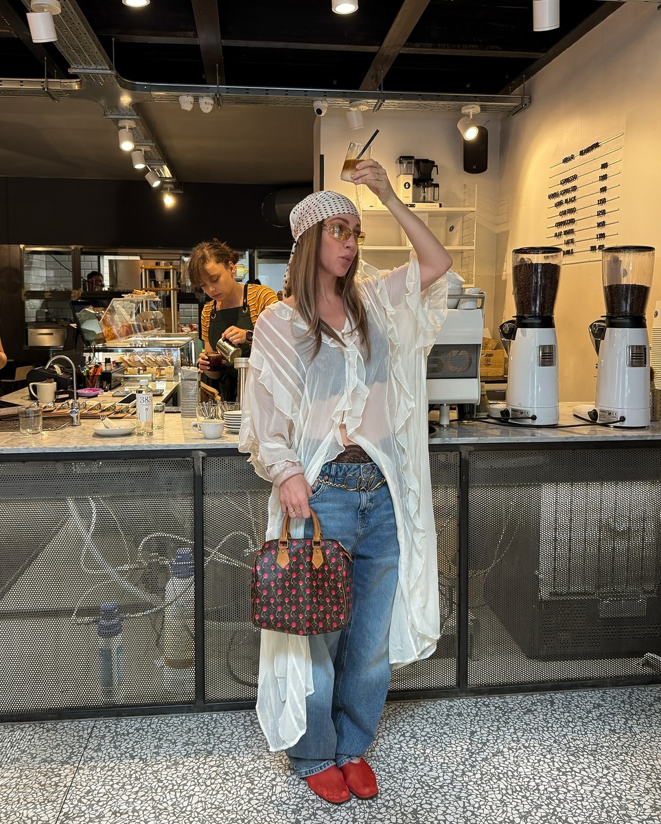 데님과 화이트 톱을 활용한 꾸꾸꾸 룩! 지지는 데님에 러플 디테일이 화려하게 들어간 시스루 화이트 톱, 그리고 두건을 이용해 보헤미안 무드가 물씬 느껴지는 스타일을 보여주었습니다. 이대로 바로 뮤직 페스티벌에 가도 손색이 없을 것 같아요.