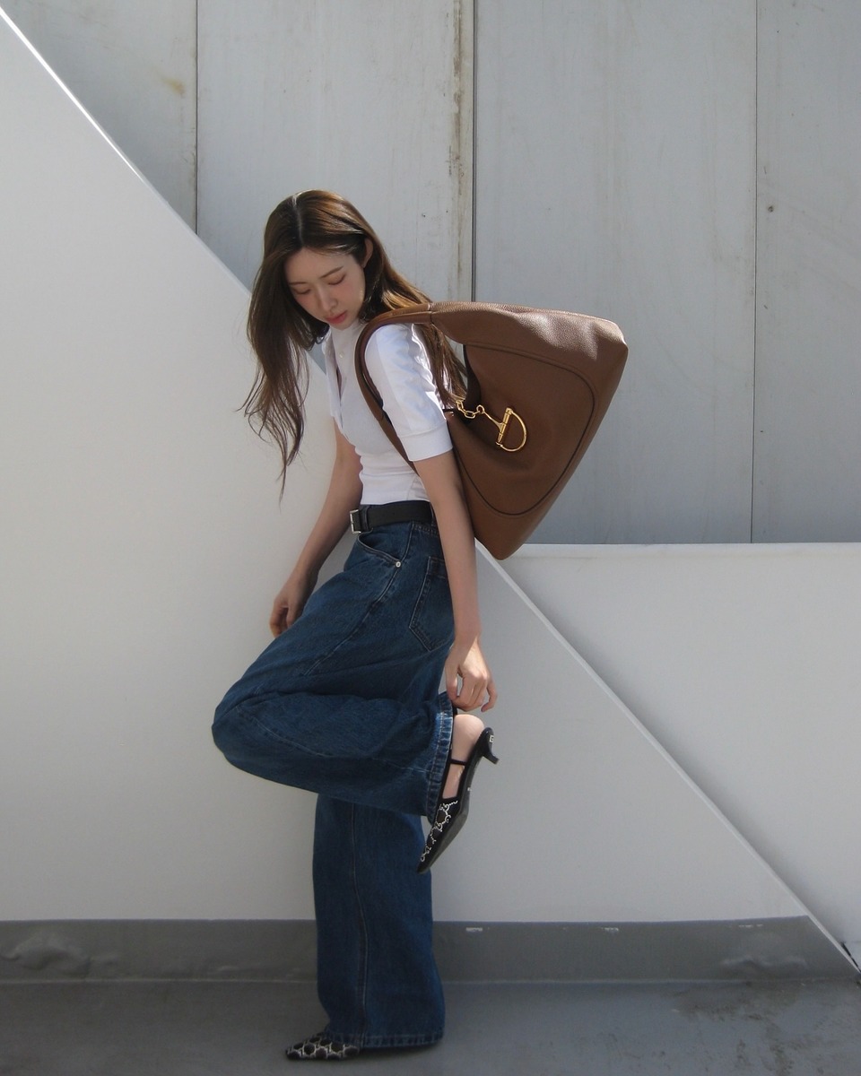 정려원은 얇고 핏되는 화이트 카디건에 슬림핏 데님, 그리고 블랙 컬러의 샌들과 숄더백으로 깔끔한 룩을 완성했습니다. 차정원의 스타일링은 ‘대비감’이 포인트! 상의는 슬림 하게, 하의는 와이드 데님을 착용했고 슈즈는 앞코가 날렵한 스틸레토를, 가방은 다소 볼륨감이 느껴지는 디자인의 구찌 소프트빗을 들어주었습니다. 상의와 신발을 슬림한 것을 골라주어 가방이 상당한 빅 백임에도 불구하고 무거워 보이지 않아요.