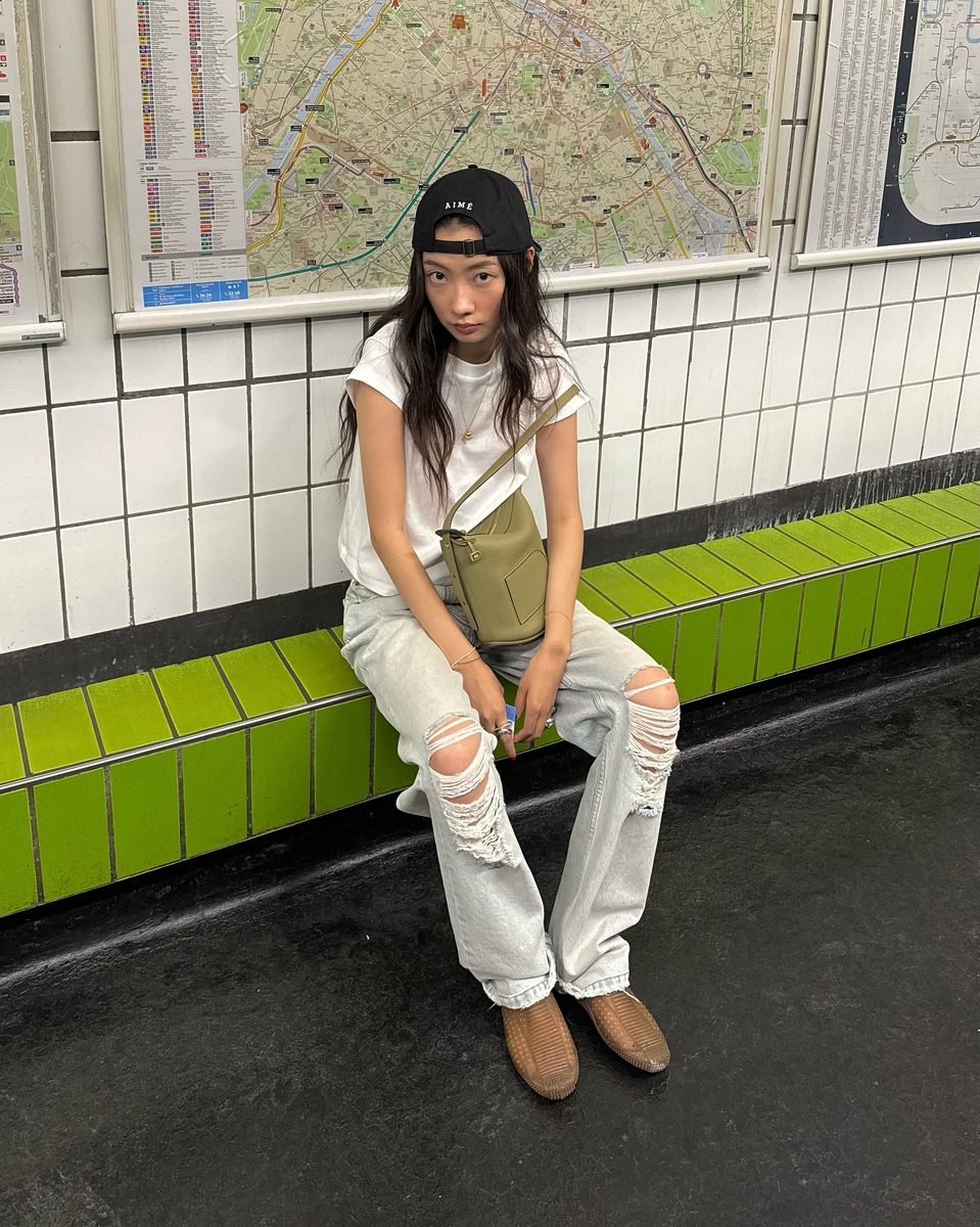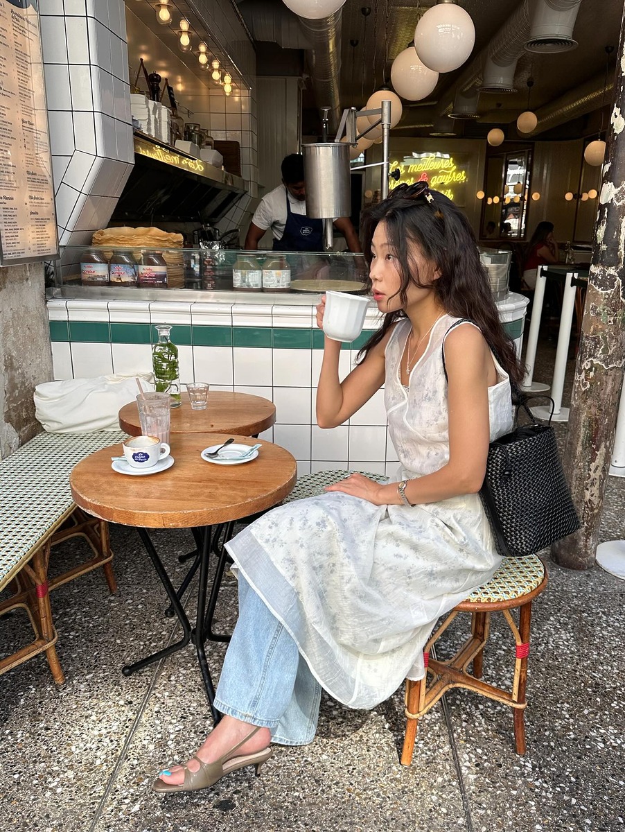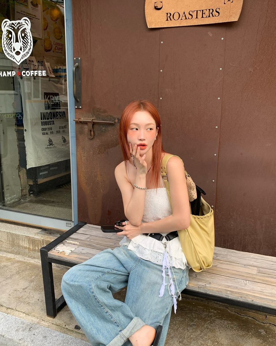 미소는 펀칭 디테일이 들어간 로맨틱한 톱에 볼드한 가죽 벨트를 둘러주고 밝은 컬러의 와이드 데님을 매치했어요. 오렌지빛 헤어와 아이스 블루 데님이 상당히 잘 어울리죠. 딘디는 잔꽃무늬가 들어간 서정적인 화이트 원피스를 청바지와 레이어링하고 뮬을 함께 신어 프렌치 시크룩을 뚝딱 완성했습니다. 이번 주말 외출룩을 고민 중이라면 이 스타일링을 참고해 보면 어떨까요?
