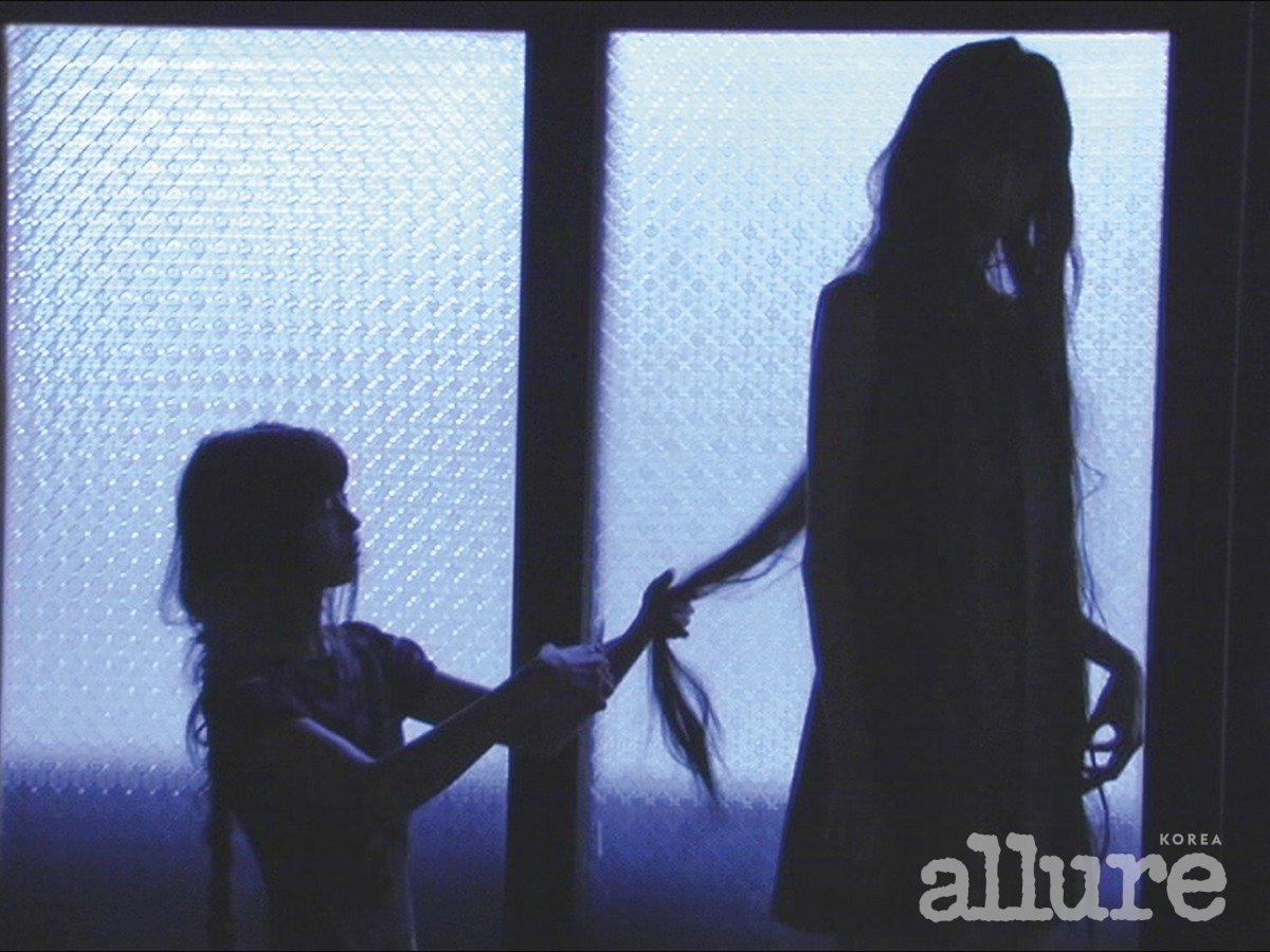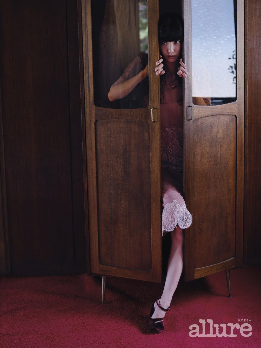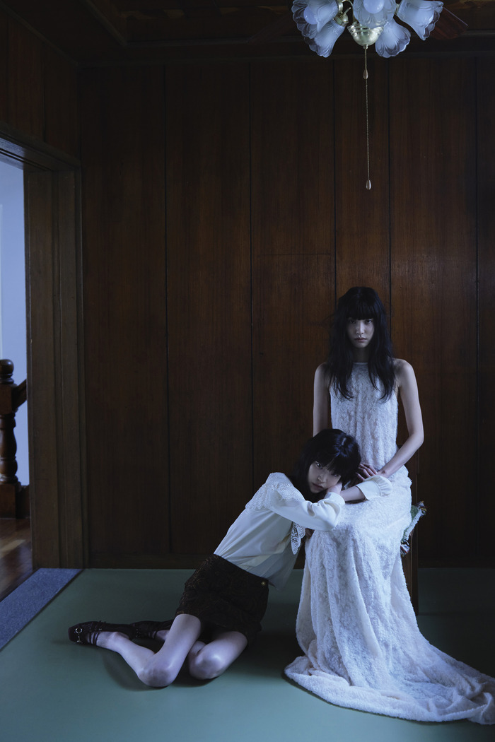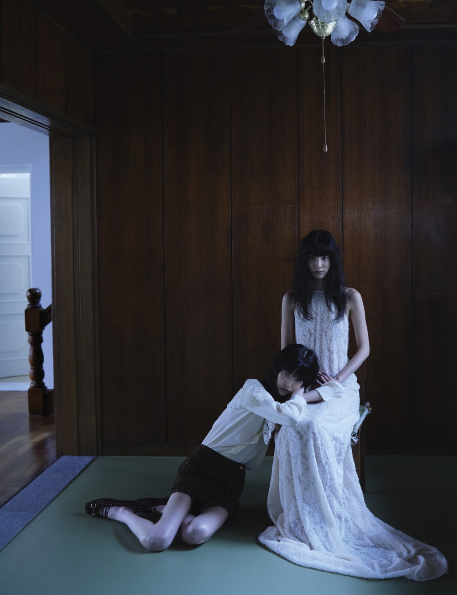 제이가 입은 레이스 트리밍 장식 블라우스, 페이즐리 태피스트리 자카드 소재의 스커트는 끌로에(Chloe). 메시 발레리나 슈즈는 구찌(Gucci). 마유가 입은 자카드 맥시드레스는 진선(Jinsun).