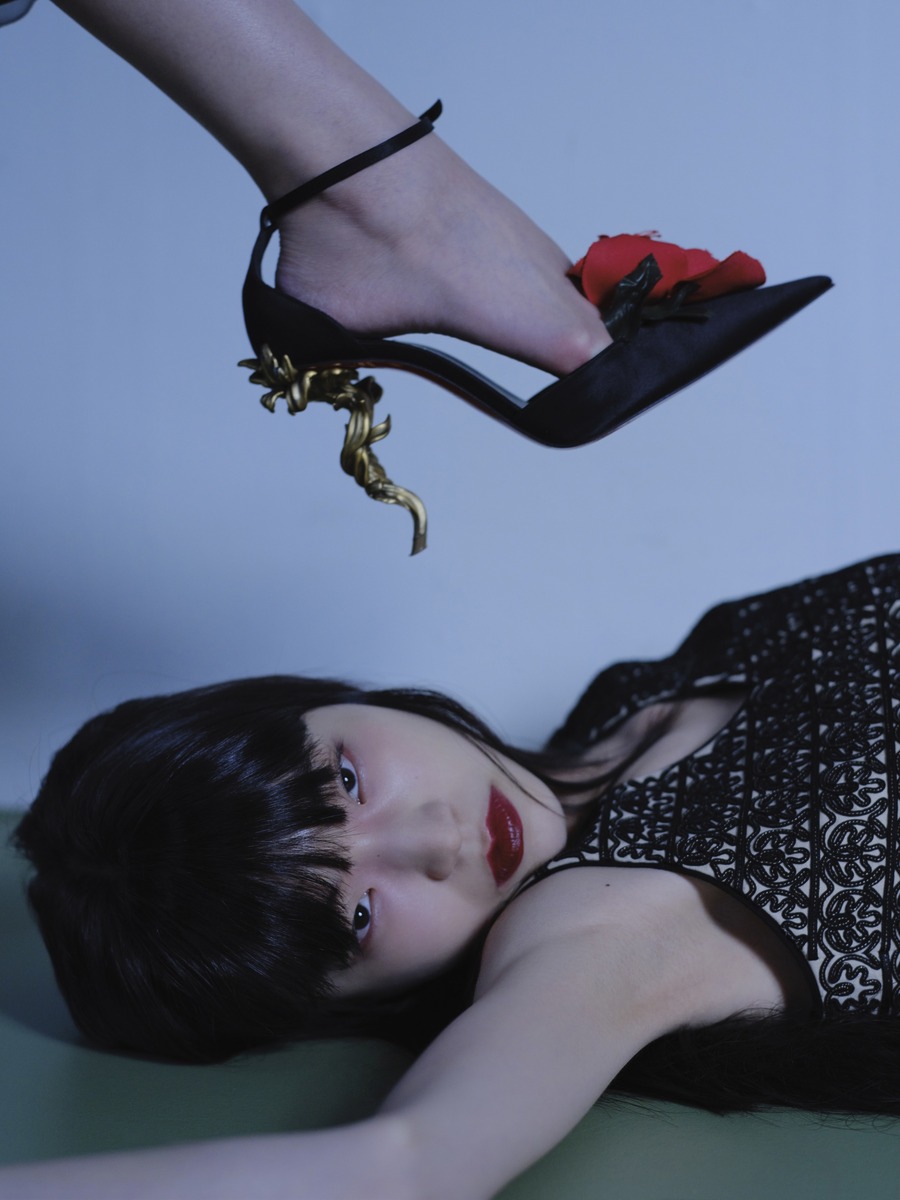 샹들리에를 연상시키는 굽과 로즈 장식이 포인트인 새틴 힐은 크리스찬 루부탱 (Christian Louboutin). 제이가 입은 엉겅퀴 자수 베스트는 로로피아나(Loro Piana).