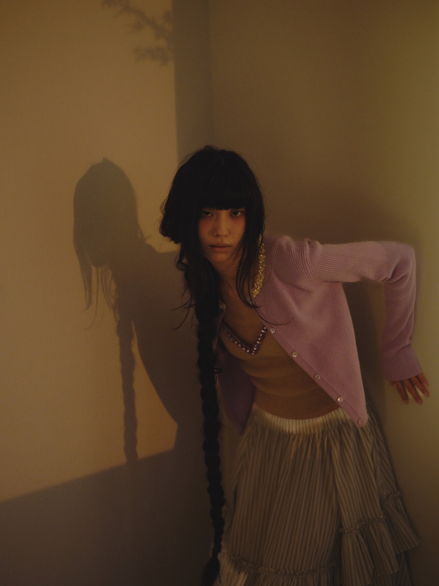엠브로이더리 넥 라인의 니트 카디건과 톱은 구찌. 프릴을 여러 겹 더한 티어드 스커트는 로뉴(Ronew).