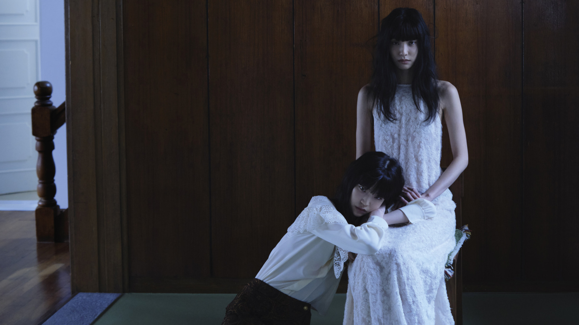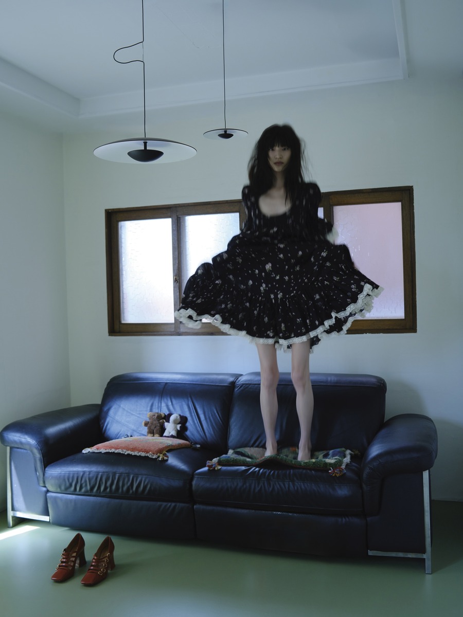 마유가 입은 플라워 패턴의 슬립 드레스는 루이 비통(Louis Vuitton). 제이가 입은 리본 타이 원피스는 셀프포트레이트(Self-Portrait).