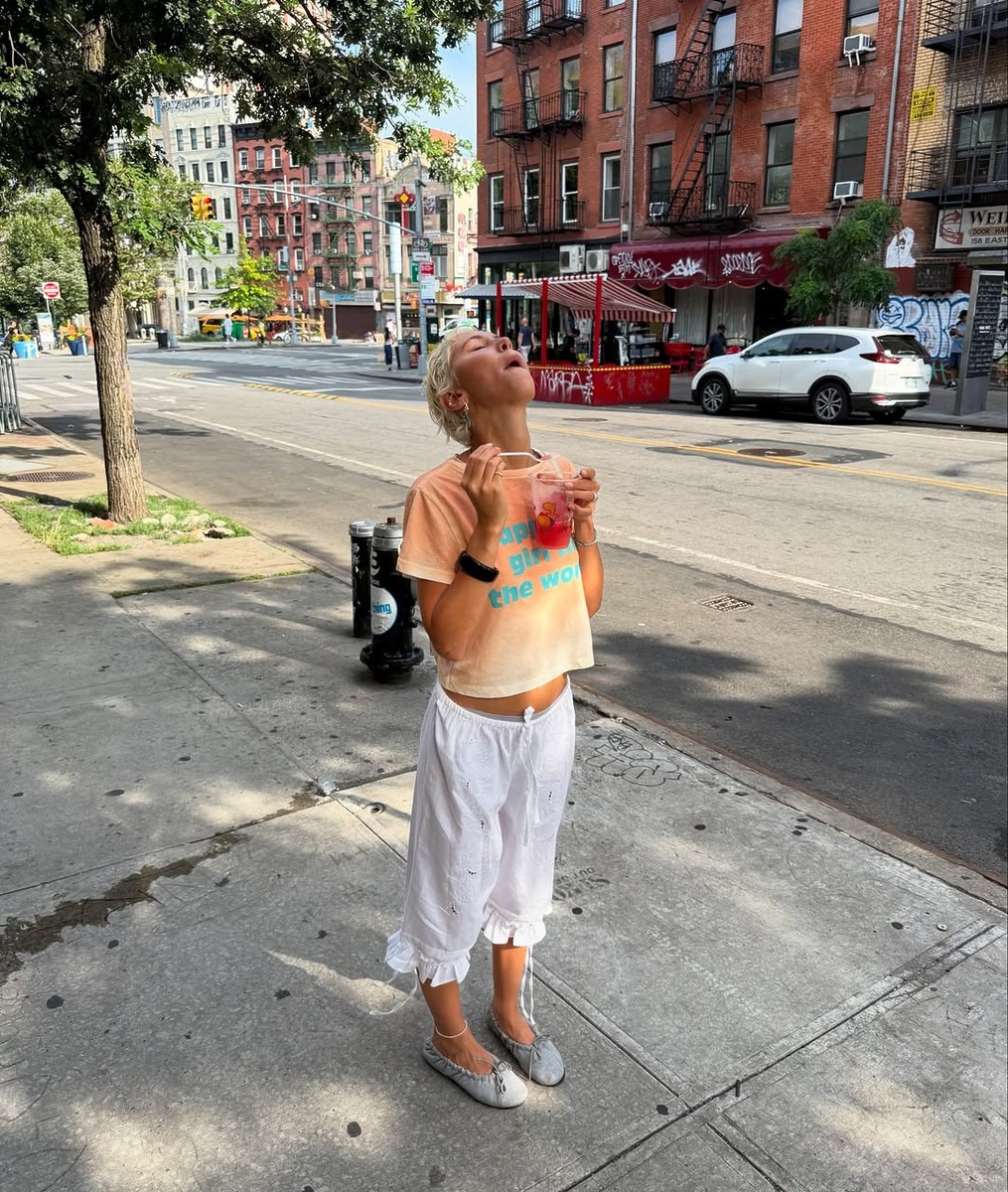그녀의 스타일은 자유로움 그 자체에요. 삐쭉빼쭉 자유롭게 뻗은 매력적인 금발의 쇼트 헤어가 그녀 특유의 유니크한 분위기를 완성시키죠. 크롭트 톱에 7부 길이의 파자마 팬츠를 입거나, 구멍이 숭숭 뚫린 낡은 티셔츠에 프라다의 실크 쇼츠를 매치하기도 해요. 여기에 엄마의 옷장에서 꺼내온 듯한 오래된 명품백을 들고, 목걸이와 팔찌, 반지 등을 두서 없이 착용하죠. 아이리스 로의 이런 아웃핏은 얼핏 즉흥적으로 보이지만 절묘한 균형을 이뤄 독특하고 개성 넘치는 스타일을 완성해 보는 재미를 선사해요.