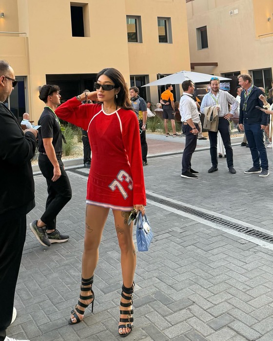 지난해 12월에는 F1의 마지막을 알리는 아부다비 그랑프리를 찾은 모습이 포착되기도 했습니다. 블록 코어 무드의 스포츠 드레스와 아주 볼드한 글레디에이터 샌들로 거친 F1을 패션으로 해석했죠.