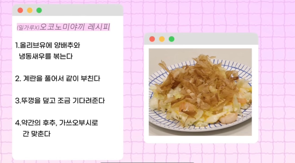 밀가루 없이도 충분히 맛있게 즐길 수 있는 ‘신현지표 오꼬노미야끼’! 몸에도 좋고, 다이어트에도 효과적인 양배추! 그녀는 뉴욕에서 활동 중 양배추 샐러드나 쌈으로 식단을 하다 어느 순간 물려 직접 이 메뉴를 개발하게 되었다고 하는데요. 만드는 방법이 너무 간단해 ‘이렇게만 해도 완성?’이라는 생각이 들지만, 맛과 식감 모두 훌륭합니다. 재료는 양배추, 냉동 새우, 계란 2알, 통후추, 가쓰오부시(없어도 무방), 그리고 올리브유면 충분합니다. 팬에 올리브유를 두르고 잘게 썬 양배추와 냉동 새우를 볶은 뒤, 여기에 풀어둔 계란을 부어 함께 부치고 뚜껑을 덮어 잠시 익히면 됩니다. 마지막으로 약간의 통후추와 가쓰오부시로 간을 맞추면 완성. 만약 맛이 조금 슴슴하게 느껴진다면 데리야끼 소스를 곁들이면 더욱 풍미 있게 즐길 수 있습니다. 요리 초보자도 부담 없이 따라 할 수 있는 이 오꼬노미야끼는 든든한 한 끼 식사이자, 다이어트 중에도 맛있게 즐길 수 있는 최고의 메뉴이니 식단에 변화를 주고 싶을 때 꼭 따라해보세요.