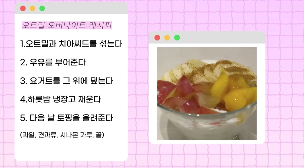 신현지 표 ‘오트밀 오버나이트’는 미국에서 대중적으로 사랑받는 QUAKER OATS의 잘게 갈린 오트밀과 요거트를 활용한 간편 다이어트 레시피입니다. 컵에 오트밀을 1/3 정도 넣고, 다이어트 중 포만감을 오래 유지시켜주는 치아씨드를 기호에 맞게 넣어 잘 섞어줍니다. 여기에 재료가 잠길 만큼 우유를 넉넉하게 부어주고, 그 위를 요거트로 덮은 뒤 하룻밤 동안 냉장고에 보관합니다. 다음 날 아침, 취향에 따라 과일, 견과류, 시나몬 가루, 꿀 등을 토핑으로 올리면 완성. 간단하지만 맛은 기본이고 포만감이 오래가, 바쁜 아침에도 든든하게 즐길 수 있는 다이어트 식단으로 제격입니다.