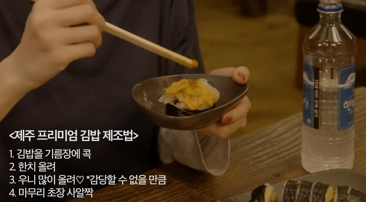 맛잘알 강민경의 제주도 또간집! 싱싱하고 쫄깃한 회 맛집이자 노을 맛집입니다. 테이블은 개인 테이블을 별도로 챙겨 오거나 가게 뒤에 있는 18코스 편의점에서 대여하면 야장 분위기를 즐길 수 있다고 해요. 강민경처럼 포장을 한다면 송송김밥에 들러 김밥과 회를 함께 먹는 방법을 추천해요. 과거 한 손님이 두 조합을 함께 먹고 추천해 친분이 전혀 없던 두 가게 사장님들이 서로를 알게 되었을 정도라고 합니다. 마치 후토마끼를 먹는 느낌이라고 하네요.