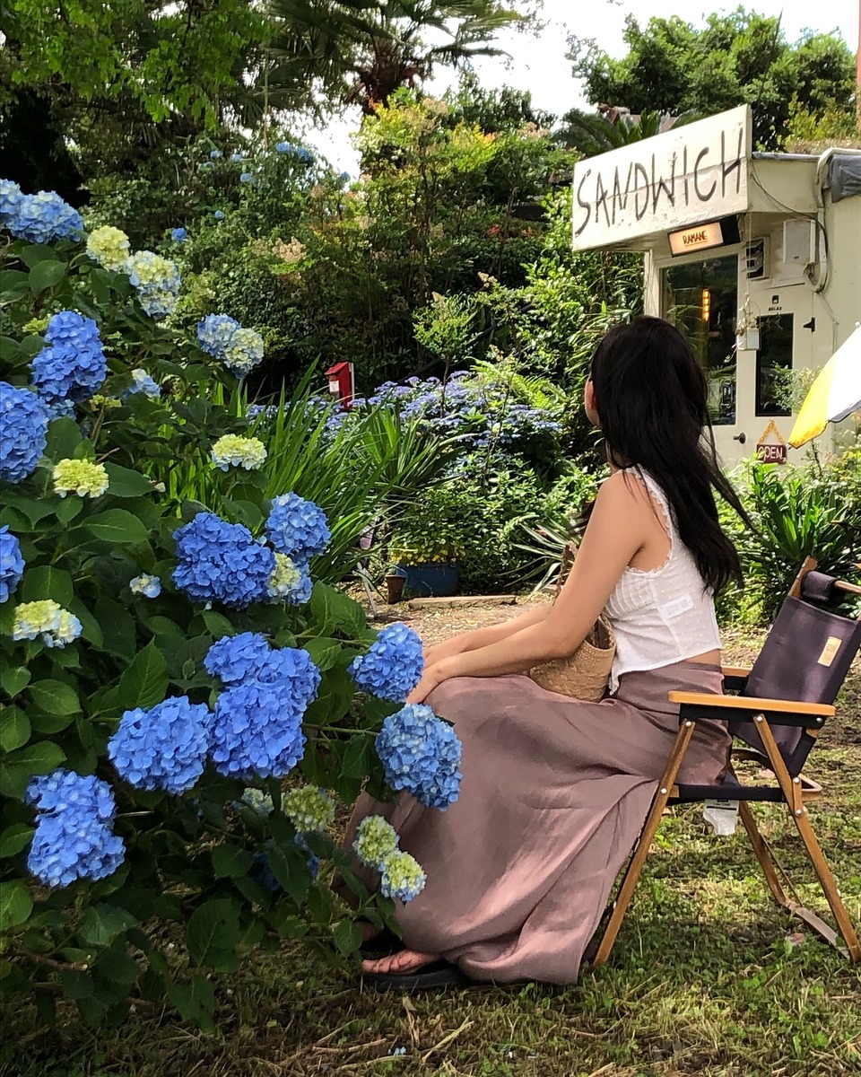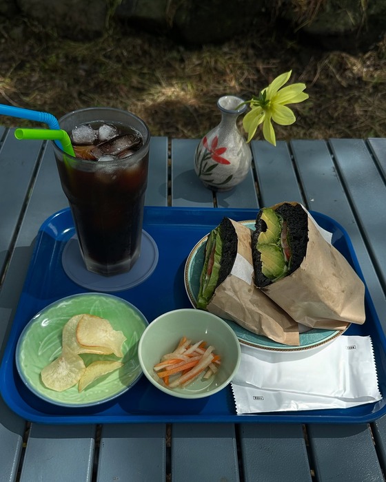 제주도까지 와서 샌드위치를 먹는다고?라고 생각할 수도 있지만 이 낭만적인 뷰를 보면 무조건 루트에 넣을 수밖에 없을 거예요. 외국의 한 정원에 와있는 듯한 기분이 드는 뷰를 지닌 이곳은 송당에서 10년간 운영해 온 터줏대감 맛집 ‘라마네 의식주’에서 운영하는 공간이라고 합니다. 게다가 샌드위치에 사용하는 유기농 먹물 포카치아와 소스를 모두 직접 만든다고 해요. 매장이 아담하고 영업시간이 짧은 편이라 오픈 런을 하거나 미리 예약을 하는 걸 추천드려요.