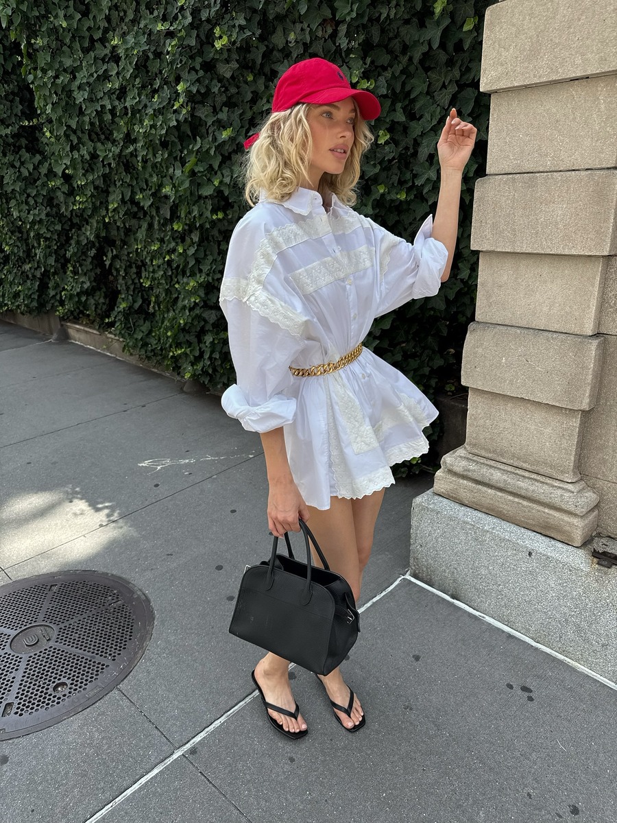 두 사람 모두 각자의 원피스와 어울리는 벨트를 활용해 허리 라인을 잡아 여성스러움을 강조한 것 역시 눈여겨 볼 포인트! 엘사는 화이트 원피스에 레드 볼캡을 얹어 생생한 컬러감을, 사나는 스카프를 머리끈처럼 활용해 우아한 매력을 강조했어요.