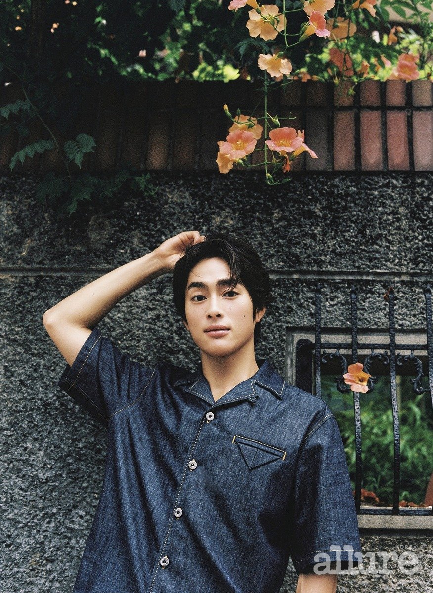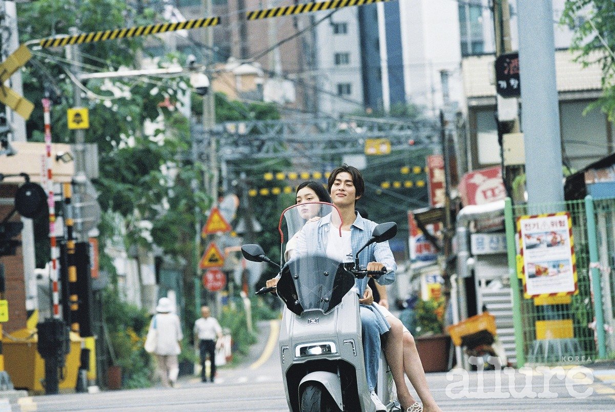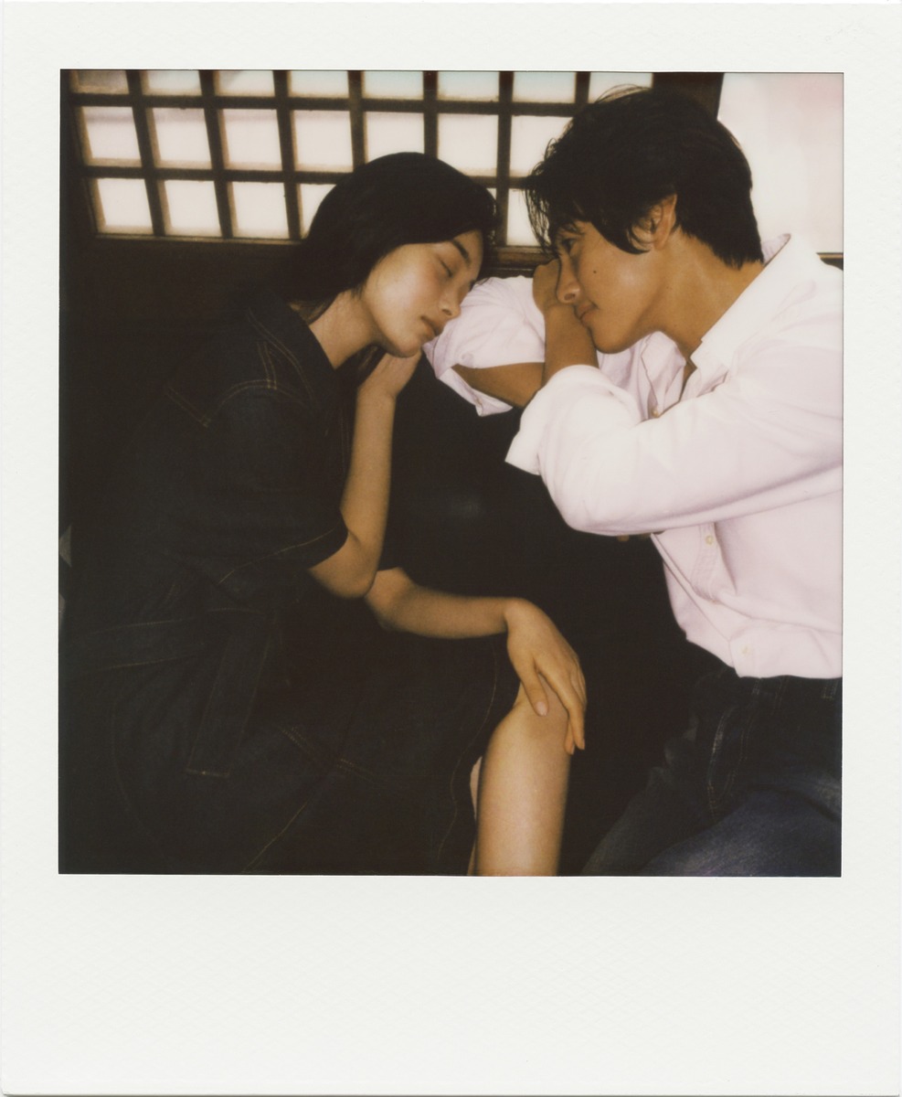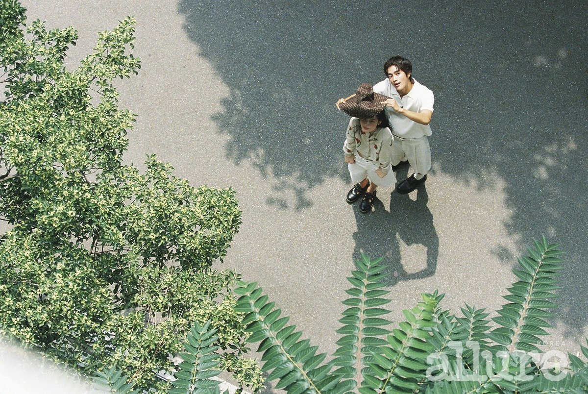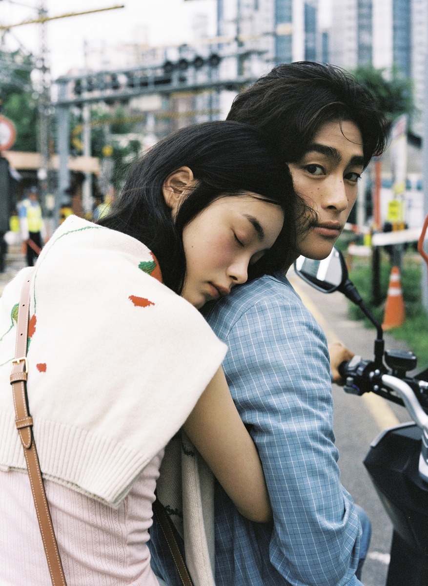 천쯔가 입은 데님 원피스는 보테가 베네타. 태준이 입은 화이트 셔츠는 폴로 랄프 로렌(Polo Ralph Lauren). 데님은 프라다(Prada). 태준이 입은 바시티 재킷과 셔츠는 루이 비통(Louis Vuitton). 천쯔가 입은 드레이프 톱은 루이 비통.