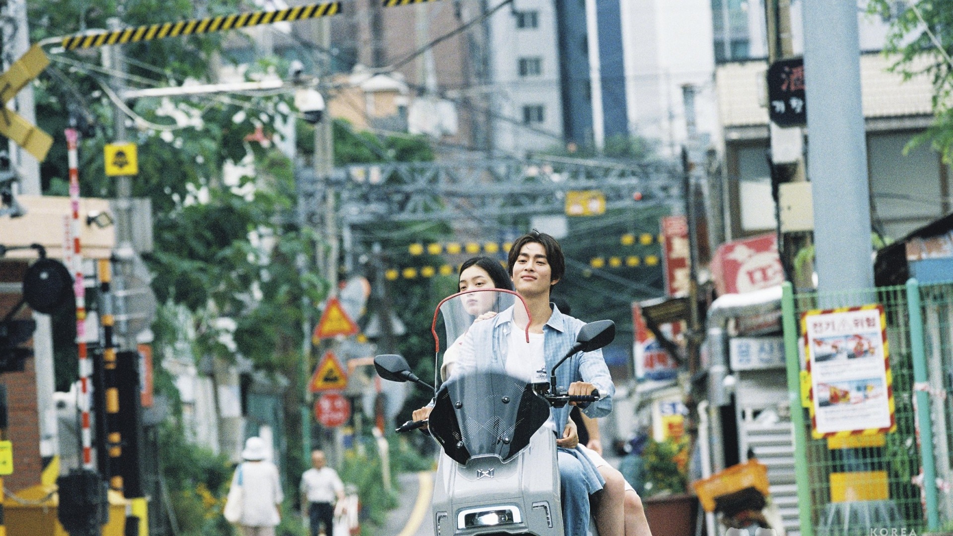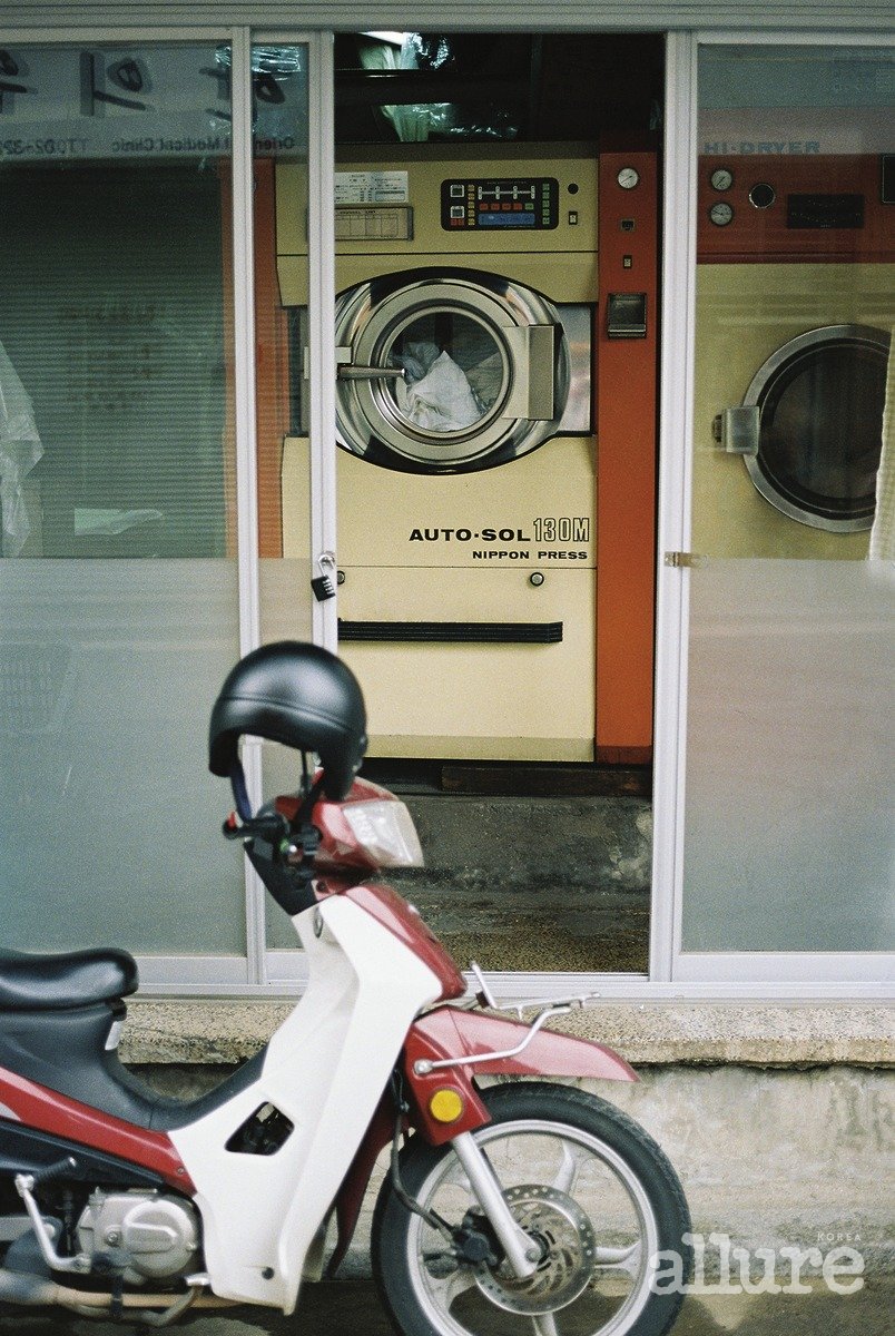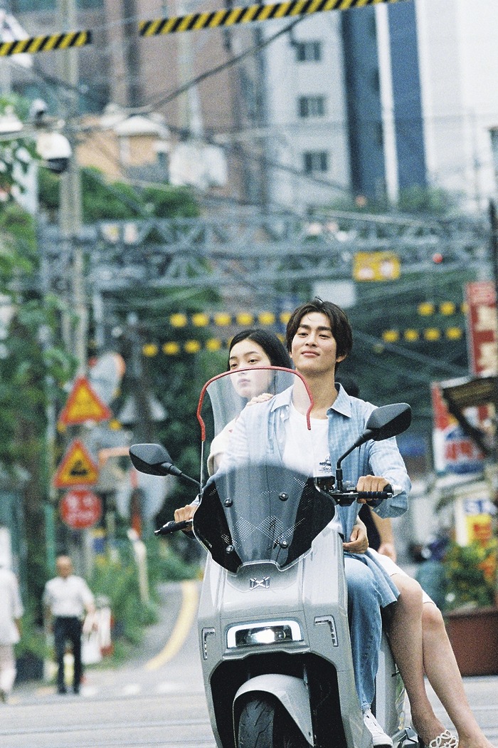 천쯔가 입은 플라워 디테일의 카디건은 배리. 화이트 팬츠는 코스. 메리제인 슈즈는 닥터마틴(Dr.Martens). 태준이 들고 있는 모자는 루이 비통. 화이트 니트 톱은 렉토(Recto). 팬츠는 골든구스(Golden Goose). 슈즈는 닥터마틴.