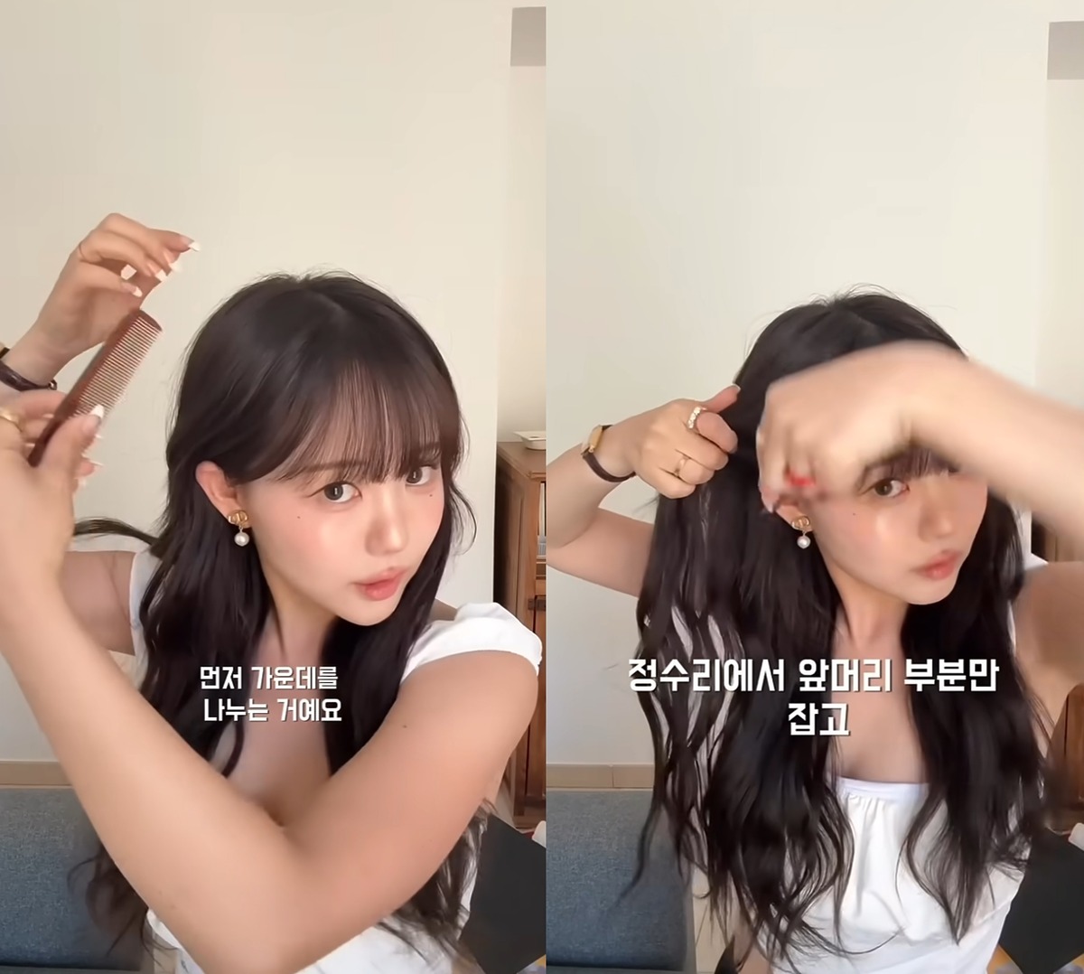 이 헤어스타일 역시 기본적으로 컬이 들어가 있는 편이 훨씬 예쁩니다. 제니나 홍영기처럼 펌을 한 상태라면 바로 5:5로 머리를 나눠서 묶어주면 되지만 그렇지 않다면 스타일링 기기를 이용해 먼저 컬을 넣어 주세요. 컬을 넣은 후 머리를 좌우 5:5로 나누고 왼쪽과 오른쪽으로 나눈 머리를 다시 앞뒤로 나눠주세요. 그리고 정수리에서부터 앞 쪽 머리만 손으로 잡아 줍니다.