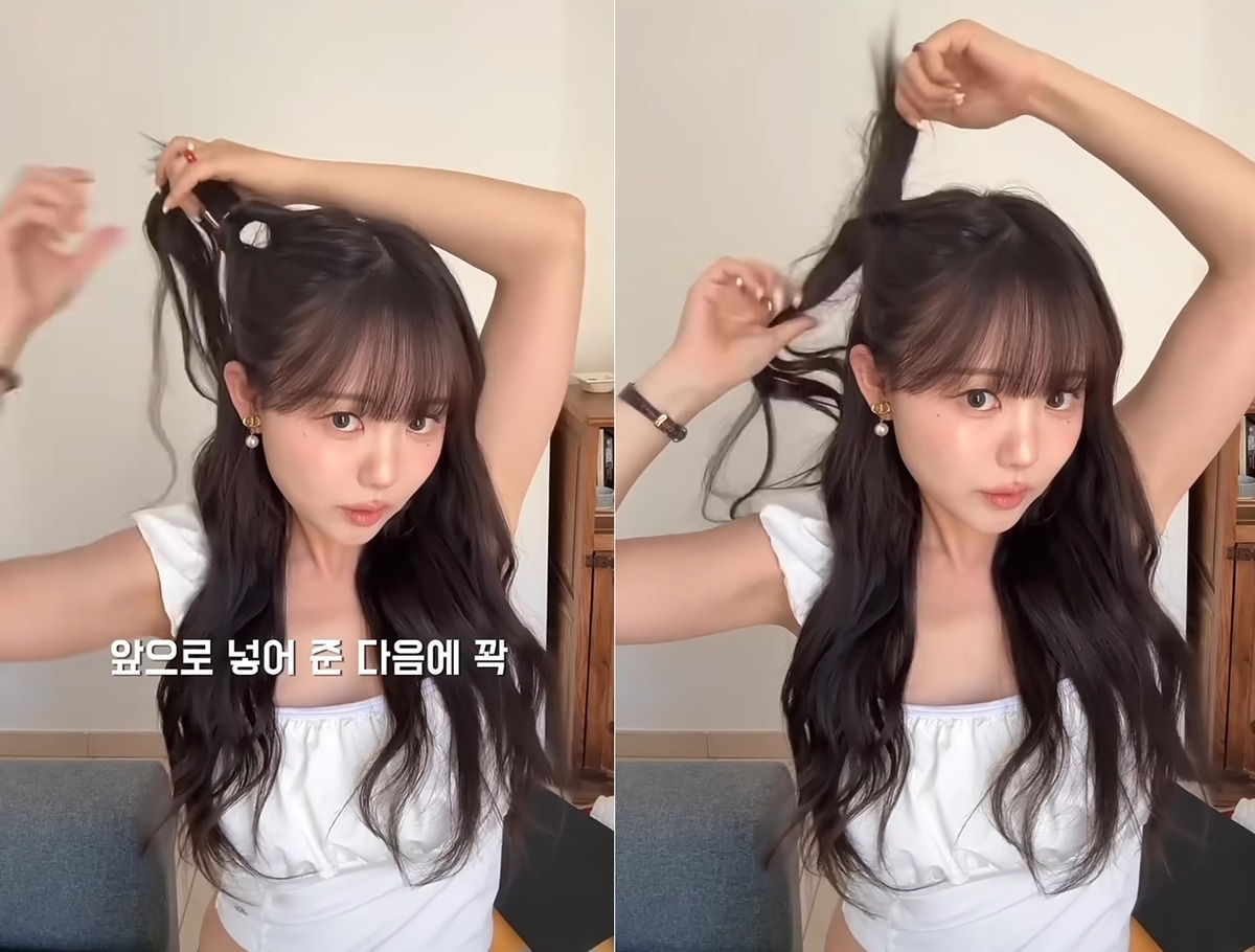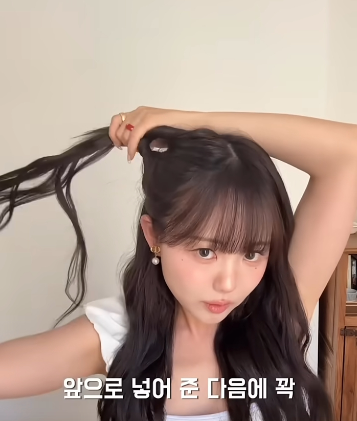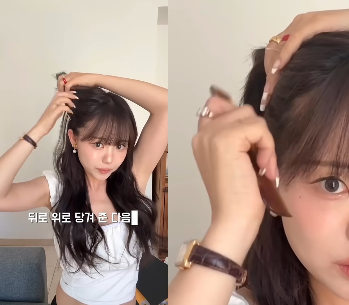 이때 잡은 머리를 위, 그리고 뒤쪽 방향으로 당겨줍니다. 이렇게 당겨주면 앞머리 부분에 빈 공간이 생기는데요, 촘촘한 빗으로 빗어서 이 부분을 잘 메꿔주세요. 그리고는 얇은 머리끈을 이용해 묶어 주세요.
