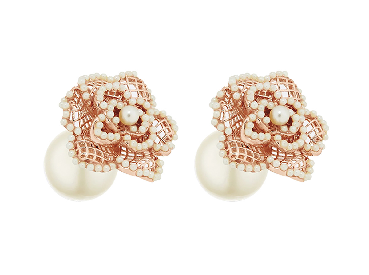 플라워 모티프에 화이트 컬러 레진 진주를 장식한 ‘트라이벌’ 이어링은 81만원 디올(Dior).