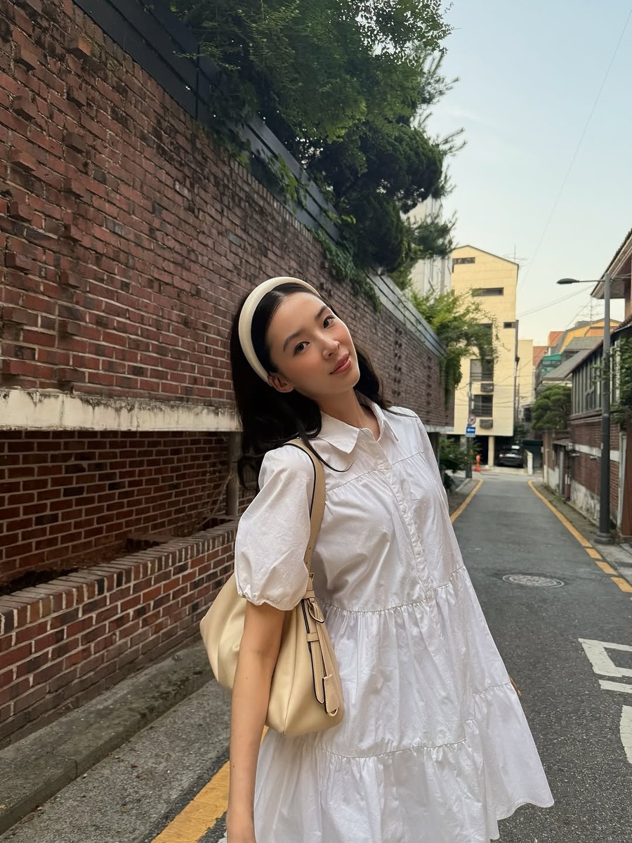 원컬러 룩이 단조로워 보일 때도 머리띠는 포인트 아이템 역할을 거뜬히 해냅니다. 아이린은 화이트 원피스에 같은 컬러의 머리띠를 매치해 로맨틱하면서도 청순한 무드를 완성했어요. 여기에 버터 옐로우 컬러 백을 들어 은은한 포인트를 더해 더 세련돼 보이죠.