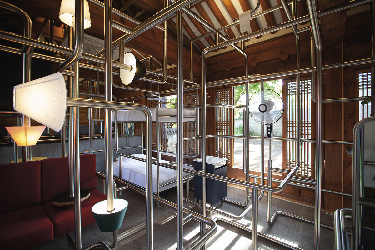 한옥의 따뜻한 목재와 금속이라는 서로 다른 재료의 대비와 조화를 많이 고민했다. 단순한 오브제가 아니라, 공간과 상호작용하는 매개체가 되기를 바랐다. 한옥 내부뿐 아니라 계단과 옥상까지 전시 공간 전체를 하나의 흐름으로 연결했다. 전통과 현대, 실내와 실외의 경계가 자연스럽게 흐려지도록 구성했고, 관람객이 공간을 이동하면서 시간과 속도의 변화를 몸으로 체험하게 하고 싶었다. 서울처럼 빠르고 역동적인 도시는 기능적인 면모가 강하다. 기술이 발전할수록 삶은 편리해지지만, 그에 반해 기후변화 같은 부작용도 생긴다. 한옥이라는 공간 안에 구조물의 밀도를 최대로 끌어올려 기능적 요소들이 과도하게 채워질 때, 오히려 본래의 기능성과 정체성을 잃어버릴 수 있다는 점을 보여주고 싶었다.