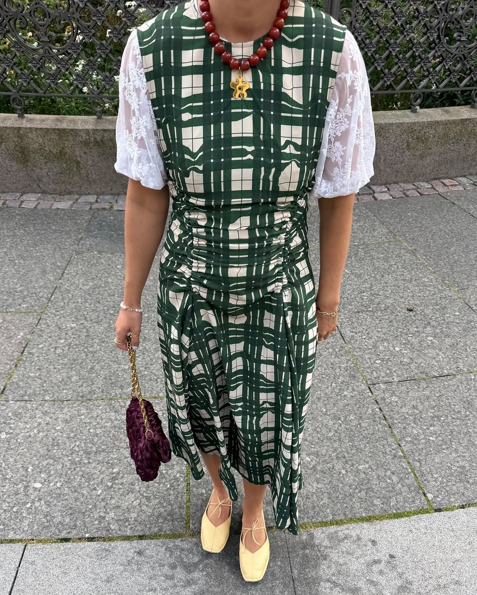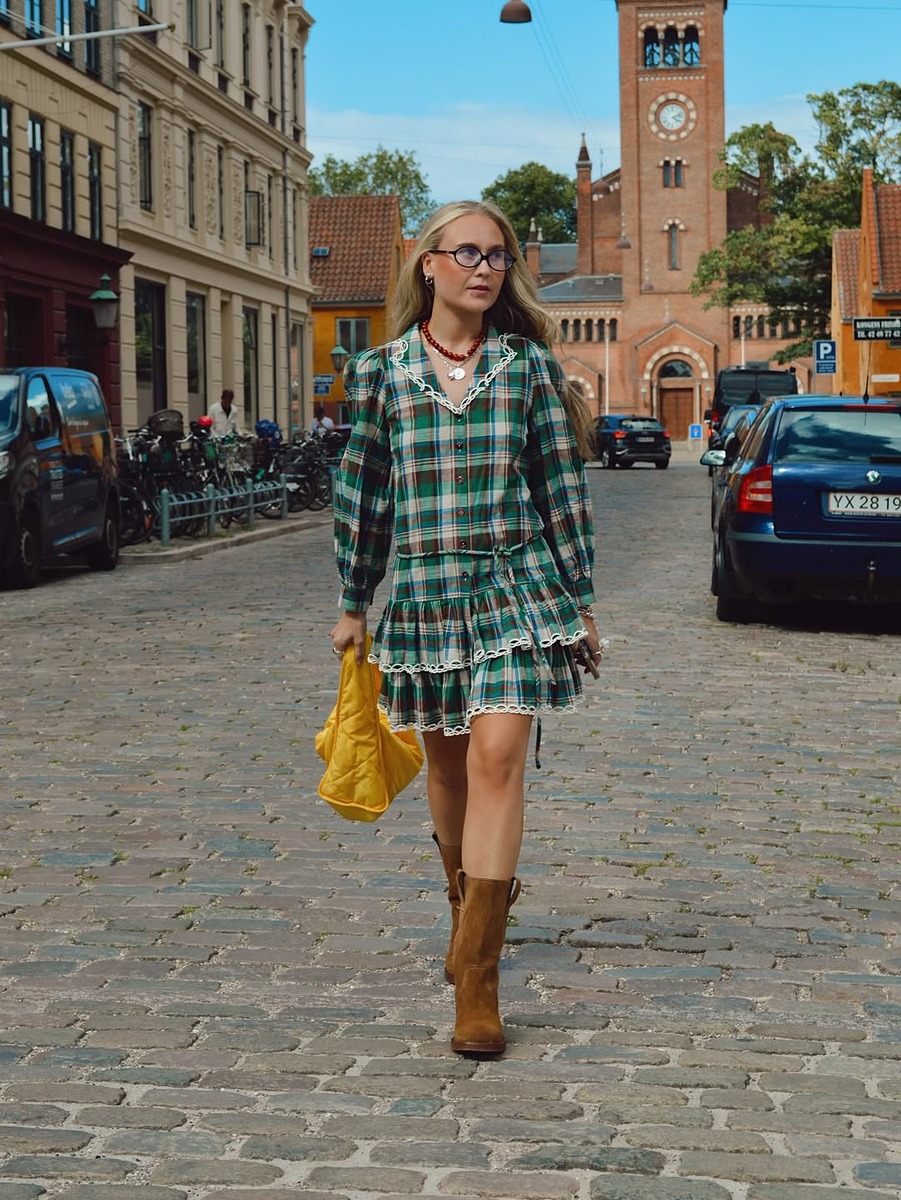 체크의 가장 큰 강점은 무엇일까요? 바로 시즌을 타지 않는 트렌디함일 거에요. 타탄, 글렌체크, 하운드투스 같은 전통 패턴은 수십 년간 꾸준히 사랑받아 왔어요. 특정 시기에만 유행하는 게 아니라, 매년 가을·겨울마다 자연스럽게 등장하는 ‘안정된 선택지’라고 할 수 있죠. 뿐만 아니라 성별이나 나이에 구애받지 않고 누구나 소화할 수 있어요. 체크를 활용한 스타일링에는 여러 가지 방법이 있지만 가장 손쉬운 방법은 마음에 드는 체크 패턴의 드레스를 입는 거죠. 드레스 하나로도 가을 감성을 물씬 풍길 수 있고, 특별한 스타일링 없이도 멋스럽고 클래식한 분위기를 연출할 수 있어요.