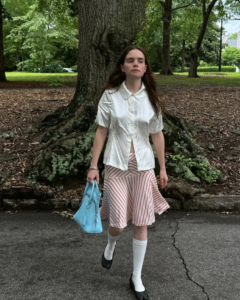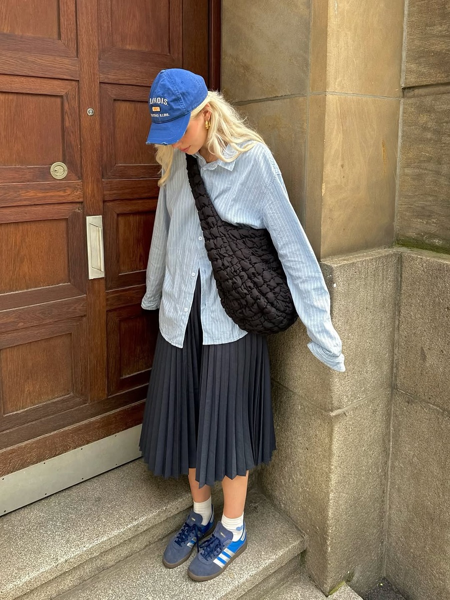 일주일 중 하루쯤은 스타일링에 힘을 빼도 좋아요. 오버사이즈 셔츠와 롱스커트, 그리고 납작한 스니커즈에 볼캡을 더해보세요. 블루에서 네이비로 이어지는 톤온톤 컬러 조합이 편안함과 세련됨을 동시에 선사합니다.