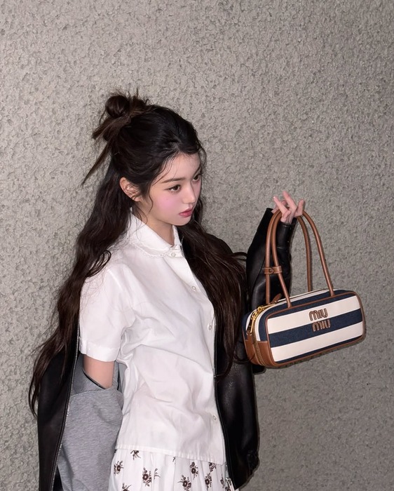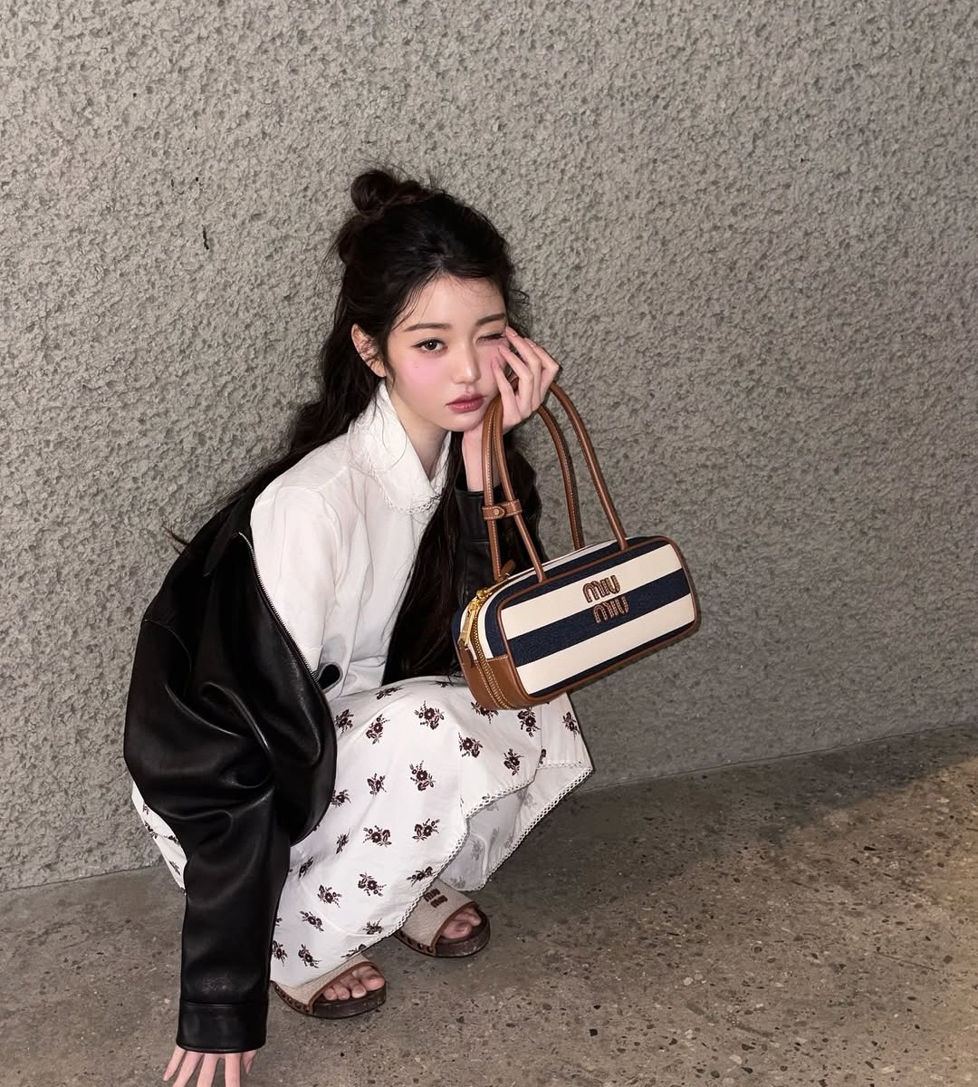 일교차가 큰 환절기, 반팔 셔츠는 매우 유용한 아이템. 반팔 셔츠에 패턴 미디 스커트를 매치하면 러블리한 무드를 살릴 수 있어요. 여기에 니삭스로 발랄함을 더하고, 기온차를 고려해 오버사이즈 레더 재킷을 걸치면 아침부터 밤까지 걱정 없죠.
