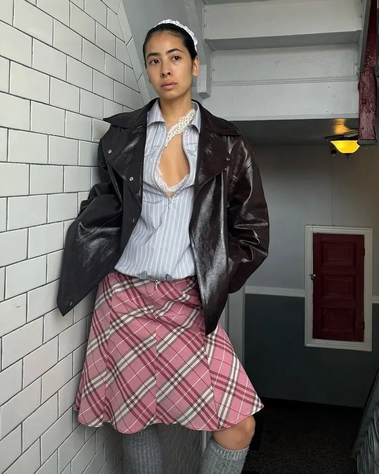 토요일에는 실험적인 무드를 즐겨도 좋습니다. 체크 스커트에 스트라이프 셔츠를 매치하면 위트 넘치는 룩이 완성됩니다. 하의는 짙은 컬러를, 상의는 연한 파스텔톤을 선택하는 것이 포인트! 상하의 밸런스를 맞춰준 덕분에 패턴의 충돌이 재미요소로 느껴지죠. 여기에 레더 재킷으로 약간의 러프한 무드까지 더하면, 주말의 활기찬 에너지가 배가됩니다.